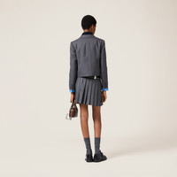 This gabardine jacket highlights Miu Miu experimentation with menswear, reinterpreting a classic garment thanks to the cropped fit and front logo, symbols of bold, versatile style. - Product code: MH1783_16E8_F0308_S_OOO - Cropped fit - Lined garment - Notch lapel - Front button closure - Straight sleeves with buttoned cuff - Flapped welt pockets - Logo label - Imported - The model is 178 cm tall and wears a size 38 Height 48cm Materials Main material: 100% Virgin Wool