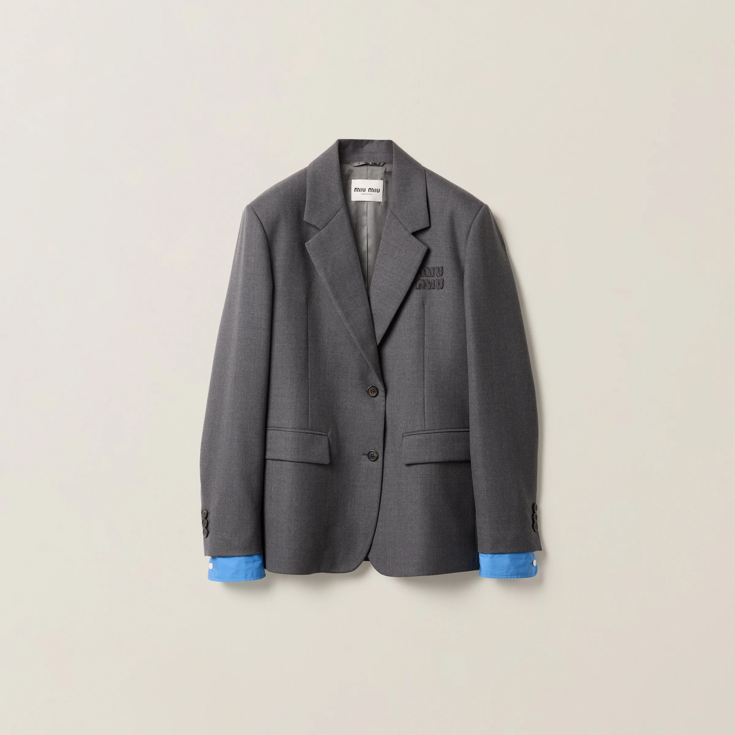 This gabardine jacket highlights Miu Miu experimentation with menswear, reinterpreting a versatile and timeless garment, ideal for looks full of layering and contrasts. - Product code: MH1974_16E8_F0308_S_OOO - Lined - Regular fit - Front closure with jeans buttons - Shirt collar - Straight sleeves and shirt cuffs - Embroidered logo - The product fits up to two sizes larger - Imported - The model is 178 cm tall and wears a size 38 Height 74cm Materials Main material: 100% Virgin Wool