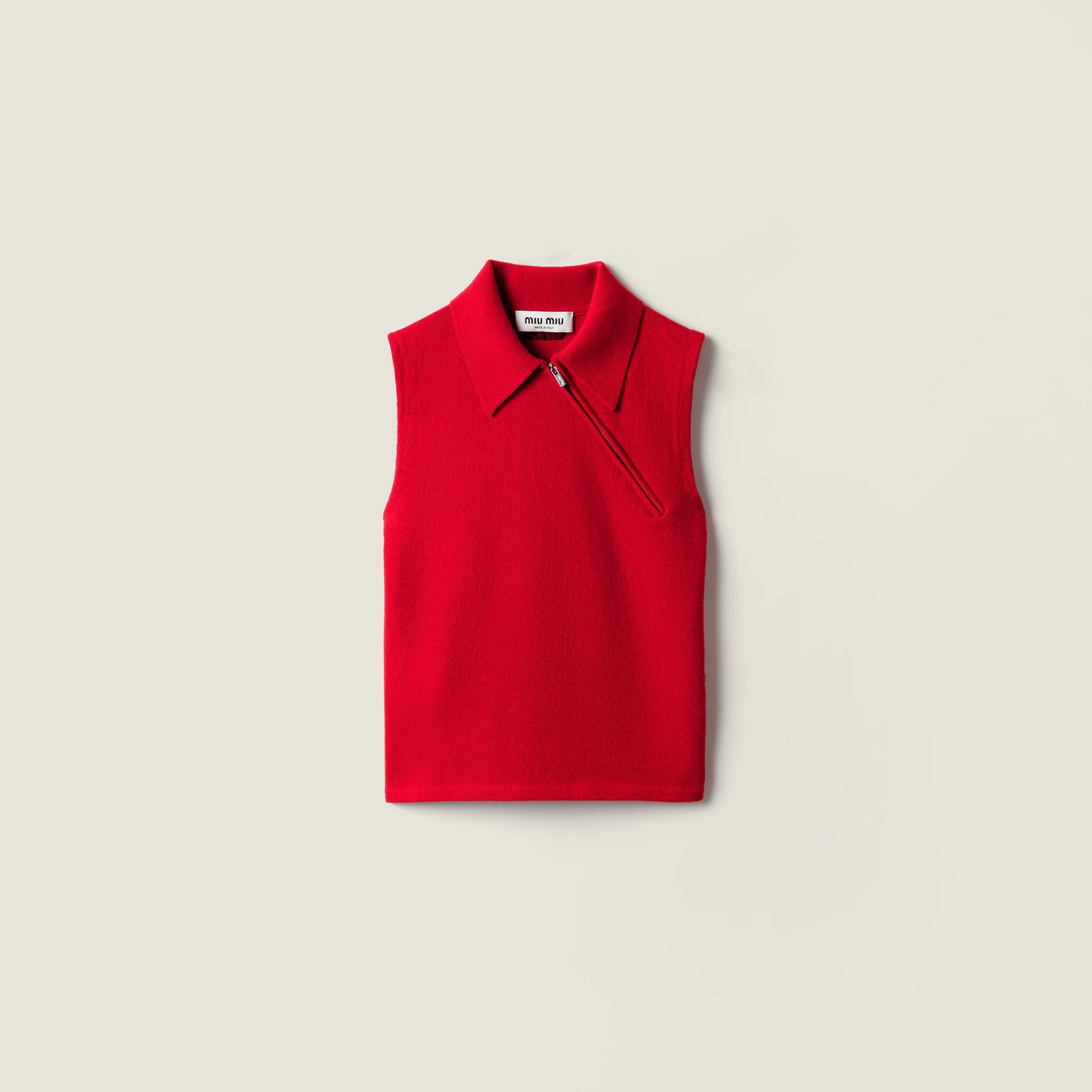 This cashmere polo shirt reinterprets a classic wardrobe staple with a new spirit. The side zipper adds an unexpected detail that reveals constantly evolving femininity. - Product code: MML00D_18A9_F0011_S_OOO - Plain knit - Slim-fit silhouette - Sleeveless - Ribbed knit collar - Semi-raglan shoulder - Side zipper closure - Intarsia logo - Imported - The model is 177 cm tall and wears a size 38 Height 50cm Materials Main material: 100% Cashmere