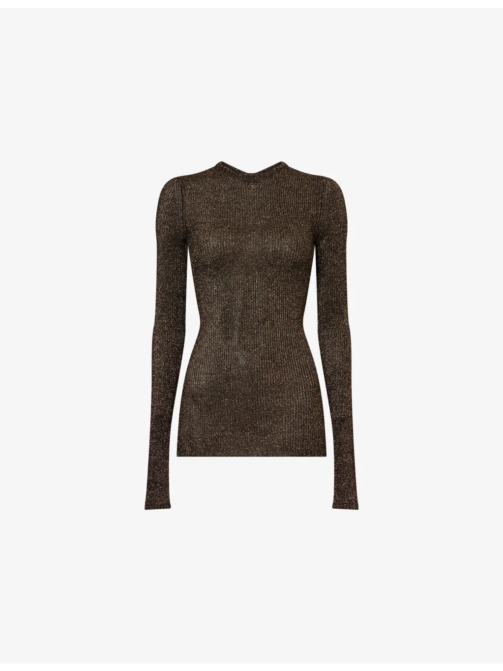 PRODUCT DETAILS - Miu Miu knitted top - 66% viscose, 34% metallic fibres - Slim fit, round-neck, long sleeves, brand patch at front, V-neck at back, all-over knitted and ribbed, all-over metallic weave - Dry clean - Made in Italy - True to size - Model is 5ft 10in/1.78m and wears a size UK 8 - Lightweight, stretchy Ref: R04494531