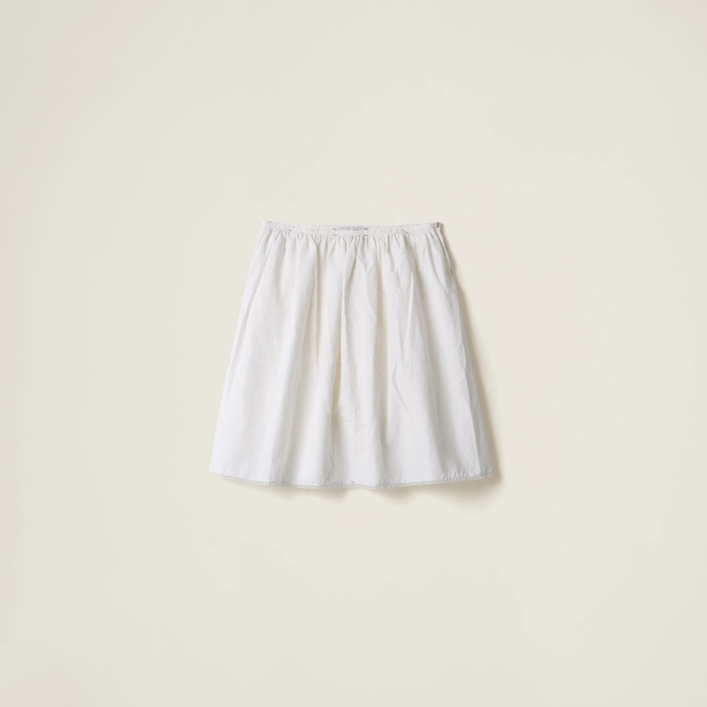 The minimalist style of this poplin skirt embodies Miu Miu's iconic essence, elegantly completing multiple looks with authentic elegance. - Product code: MG2425_163M_F0009_S_OOO - Flared fit - Side button closure - Hem with bobbin lace trim - Knit logo label - Imported - The model is 178 cm tall and wears a size 38 Height 55cm Materials Main material: 80% Cotton 20% Linen