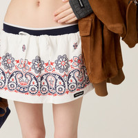 The bandana print, an emblem of Miu Miu's summer essence, adds color to the feminine line of this miniskirt characterized by playful and evocative references to beachwear. - Product code: MG2200_17XZ_F0UB0_S_OOO - «Bandana» print - Mini fit - Unlined garment - Inseam pockets - Internal poplin shorts - Elasticized drawstring waistband - Knit logo label - Imported - The model is 180 cm tall and wears a size 38 Materials Main material: 80% Cotton 20% Linen