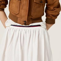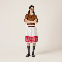 The bandana print, an emblem of Miu Miu's summer essence, adds character to the decorative band applied to this slubbed poplin skirt with a washed effect and artisanal touch. - Product code: MG2487_17LZ_F0970_S_OOO - «Bandana» print - Flared fit - Lined garment - Side button closure - Inseam pockets - Knit logo label - Imported - The model is 178 cm tall and wears a size 38 Materials Main material: 80% Cotton 20% Linen