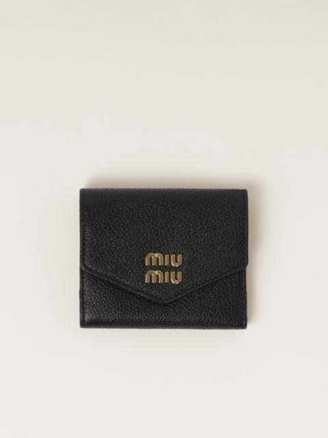 The quality of the leather and the iconic touch of the Miu Miu logo enhance the sleek lines of this new small leather wallet. Several internal compartments, card slots, and compact lines complete the design with functional details. - Product code: 5MH043_ADT7_F0002 - Metal lettering logo - One bill compartment - Four card slots - Two internal pockets - Internal coin pocket with flap - One external pocket -- Moire lining - Imported Height 8.5cm Width 10cm Materials Main material: Calfskin