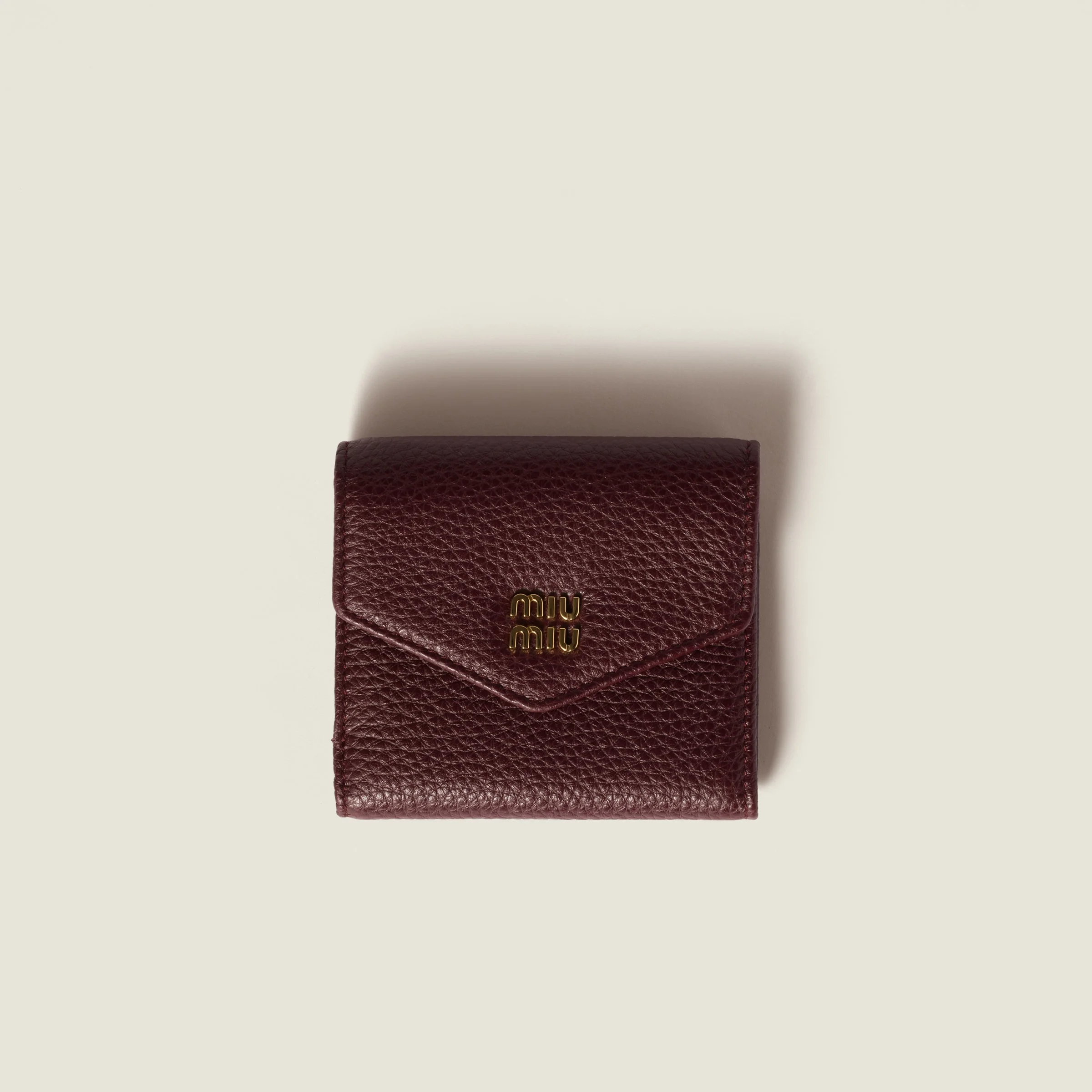 This wallet with a sleek shape and compact size stands out for the fine nappa leather craftsmanship and the iconic embossed Miu Miu logo, expressing bold and functional elegance. - Product code: 5MH051_ADT7_F0007 - One bill compartment - Three card slots - Three document pockets - Internal zipper coin pocket - Snap closure - Moire lining - Metal lettering logo - Imported Height 8cm Width 9cm Materials Main material: Calfskin