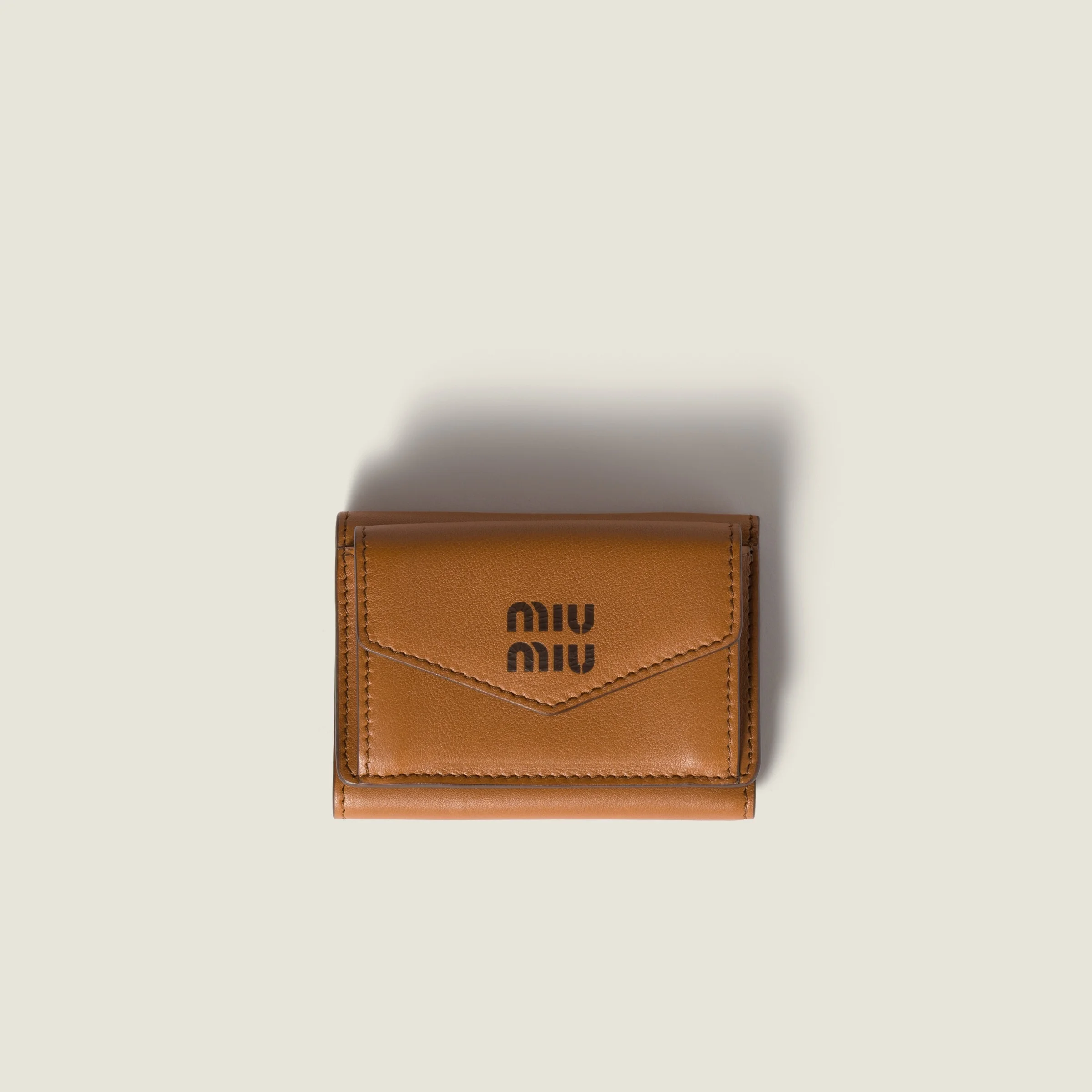 Soft leather and the iconic Miu Miu logo in a contrasting color give the compact design of this wallet contemporary sophistication and style. - Product code: 5MH021_2CV6_F0NQY - One bill compartment - Three card slots - External coin pocket with flap - Snap closure - Moire lining - Screen-printed logo - Imported Height 7cm Width 10cm Materials Main material: Calfskin