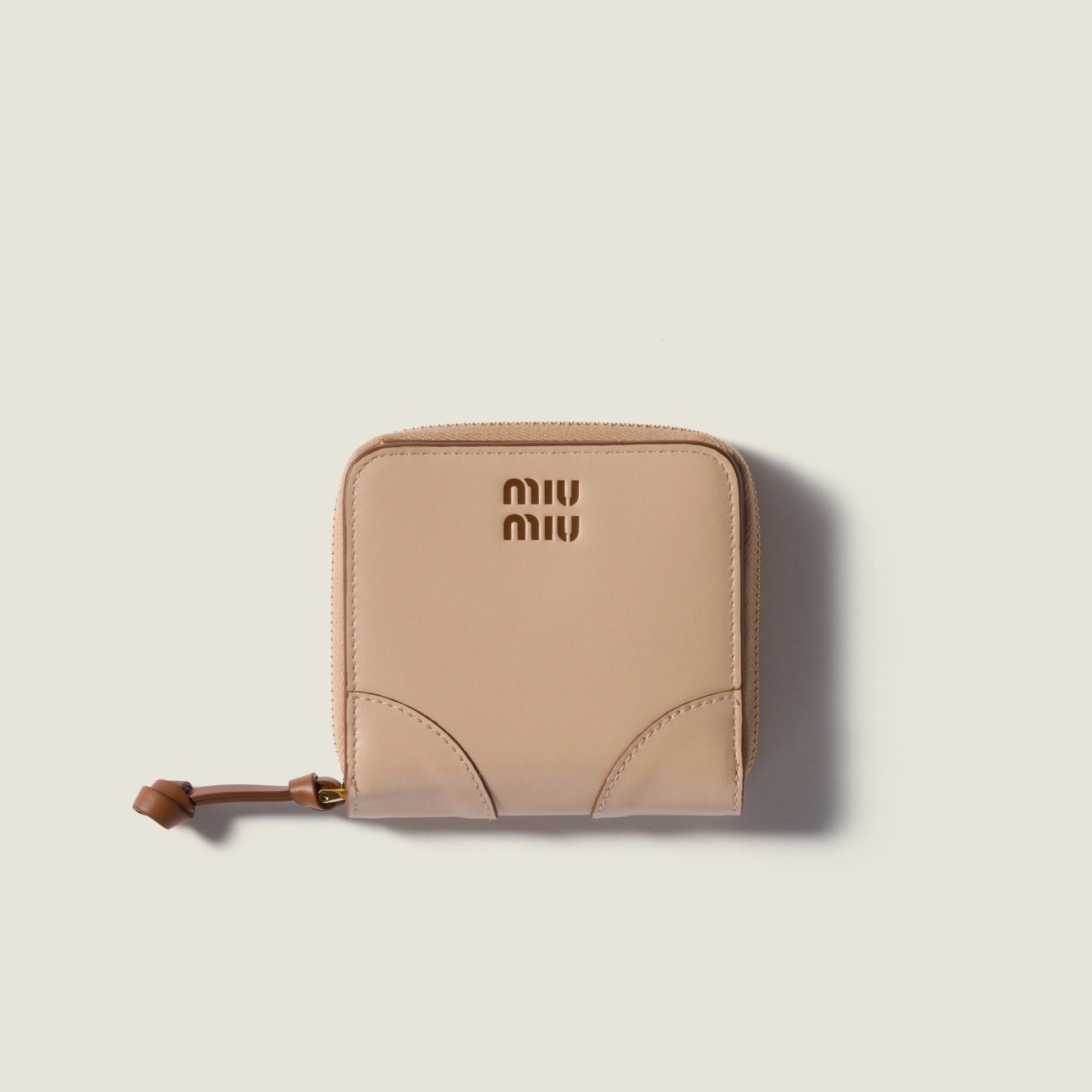 Simple in shape and compact in size, this wallet reinterprets Miu Miu's classic craftsmanship through a functional design and the emblematic logo that underlines its understated modernity. - Product code: 5ML522_2CV6_F0A2C - One bill compartment - Six card slots - Two internal pockets - External zipper coin pocket - Zipper closure - Moire lining - Screen-printed logo - Imported Height 9.5cm Width 10.5cm Materials Main material: Calfskin