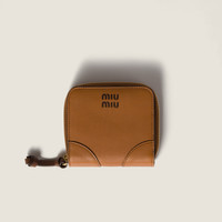 Simple in shape and compact in size, this wallet reinterprets Miu Miu's classic craftsmanship through a functional design and the emblematic logo that underlines its understated modernity. - Product code: 5ML522_2CV6_F0NQY - One bill compartment - Six card slots - Two internal pockets - External zipper coin pocket - Zipper closure - Moire lining - Screen-printed logo - Imported Height 9.5cm Width 10.5cm Materials Main material: Calfskin