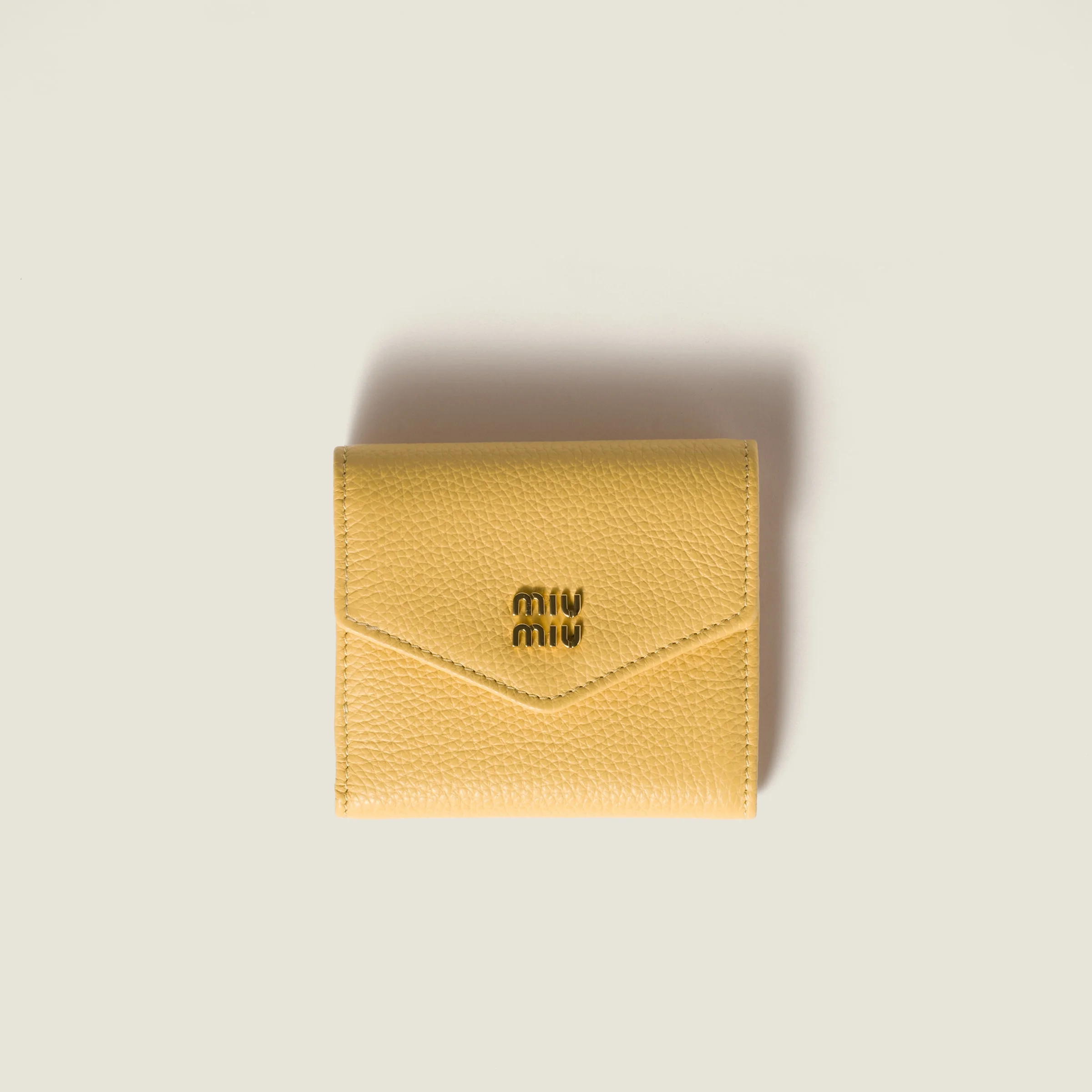 This wallet with a sleek shape and compact size stands out for the fine nappa leather craftsmanship and the iconic embossed Miu Miu logo, expressing bold and functional elegance. - Product code: 5MH051_ADT7_F0F06 - One bill compartment - Three card slots - Three document pockets - Internal zipper coin pocket - Snap closure - Moire lining - Metal lettering logo - Imported Height 8cm Width 9cm Materials Main material: Calfskin