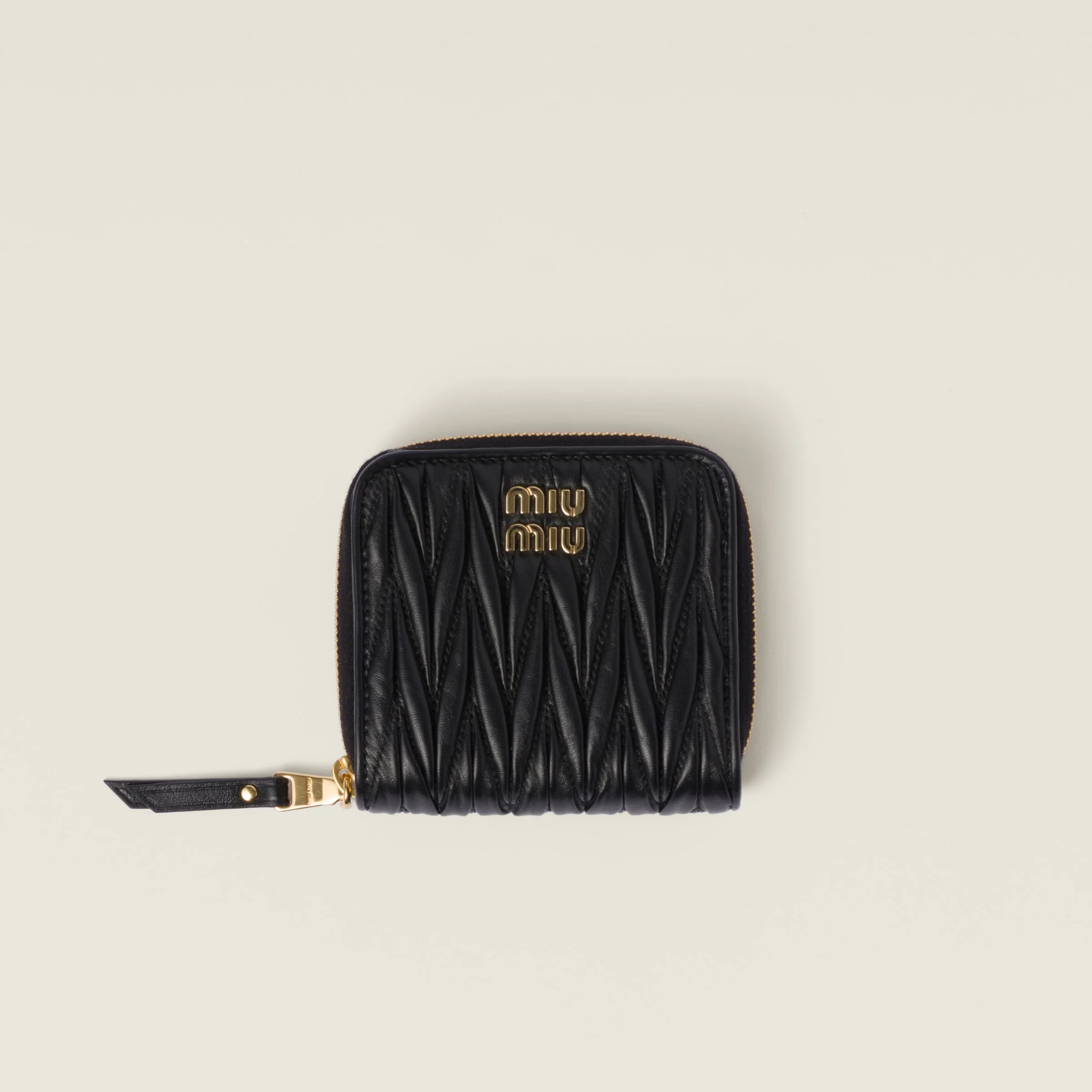 This compact wallet is made unique by the matelasse motif embellishing the soft nappa leather and the distinctive gold-tone metal Miu Miu logo. - Product code: 5ML522_AFPP_F0002 - Matelasse craftsmanship - Zipper closure - One bill compartment - Six card slots - Two internal pockets - External zipper coin pocket - Moire and leather lining - Metal lettering logo - Imported Height 9.5cm Width 10.5cm Materials Main material: Lambskin