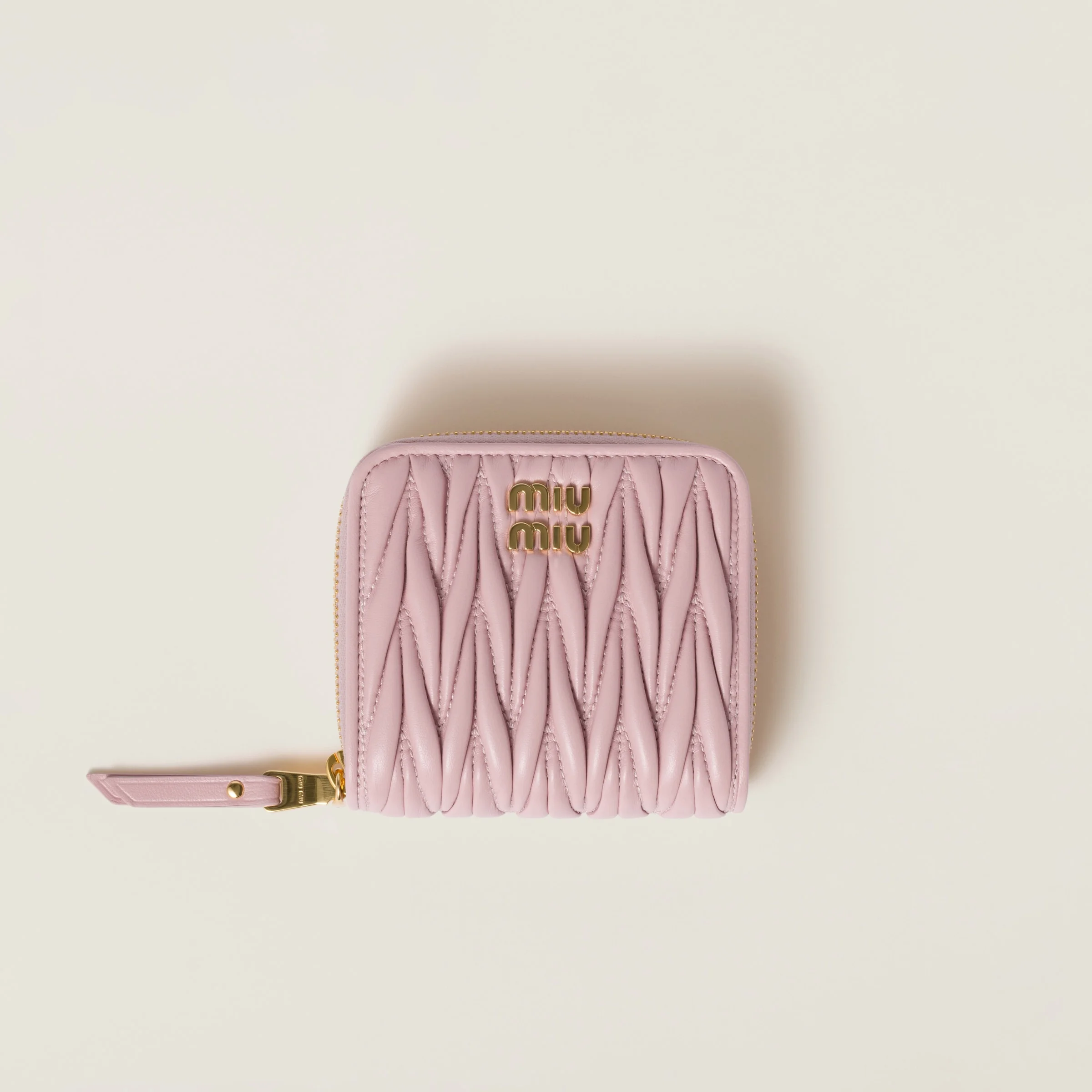 This compact wallet is made unique by the matelasse motif embellishing the soft nappa leather and the distinctive gold-tone metal Miu Miu logo. - Product code: 5ML522_AFPP_F0E18 - Matelasse craftsmanship - Zipper closure - One bill compartment - Six card slots - Two internal pockets - External zipper coin pocket - Moire and leather lining - Metal lettering logo - Imported Height 9.5cm Width 10.5cm Materials Main material: Lambskin