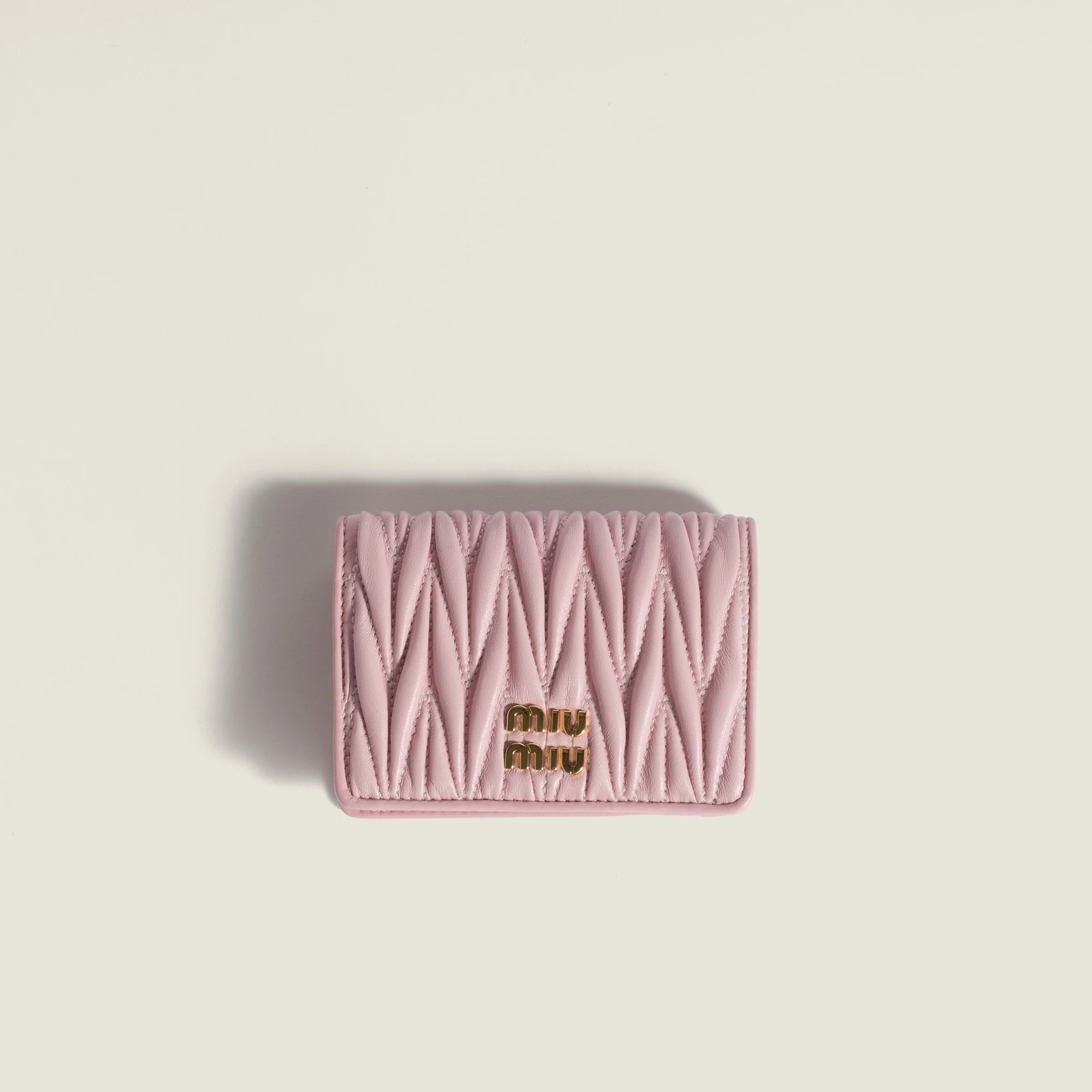 The shiny metal logo of this wallet enhances the iconic matelasse workmanship that creates a sophisticated texture on the functional design, blending exquisite craftsmanship and refined elegance. - Product code: 5MV021_AFPP_F0E18 - Matelasse motif - Four card slots - Zippered coin purse - Snap closure - Moire lining - Metal lettering logo - Imported Height 11.2cm Width 8.5cm Materials Main material: Lambskin
