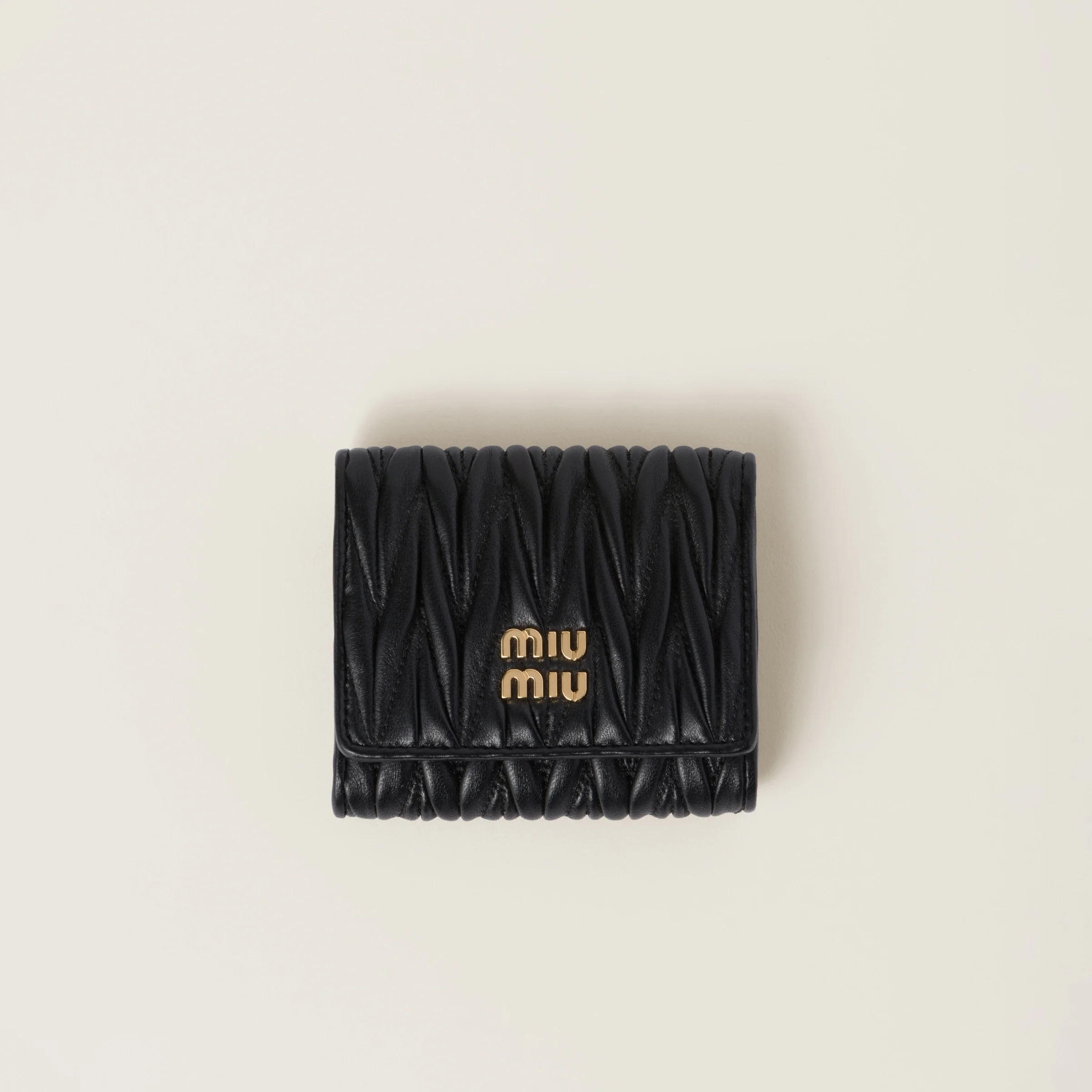 This small wallet decorated with the metal lettering logo is made of the brand's iconic matelasse leather characterized by a texture that creates a sophisticated three-dimensional effect. The practical, compact and functional wallet is full of slots and compartments. - Product code: 5MH033_AFPP_F0002 - Matelasse workmanship - Snap closure - Metal lettering logo - One bill compartment - Four card slots - Three internal pockets - Internal coin compartment with flap - Moire lining - Imported Height 7.8cm Width 10.2cm Length 3.8cm Materials Main material: Lambskin
