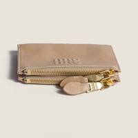 The quality of leather and the iconic touch of Miu Miu logo enrich the sleek lines of this new small leather wallet. Several internal compartments complete the design with functional details. - Product code: 5ML024_AEFX_F0065 - Snap closure - Embossed lettering logo - One bill compartment - Eight card slots - Two external zipper pockets - Moire lining - Imported Height 8.5cm Width 11.5cm Materials Main material: Lambskin