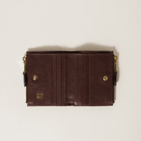 The quality of leather and the iconic touch of Miu Miu logo enrich the sleek lines of this new small leather wallet. Several internal compartments complete the design with functional details. - Product code: 5ML024_AEFX_F0NBL - Snap closure - Embossed lettering logo - One bill compartment - Eight card slots - Two external zipper pockets - Moire lining - Imported Height 8.5cm Width 11.5cm Materials Main material: Lambskin