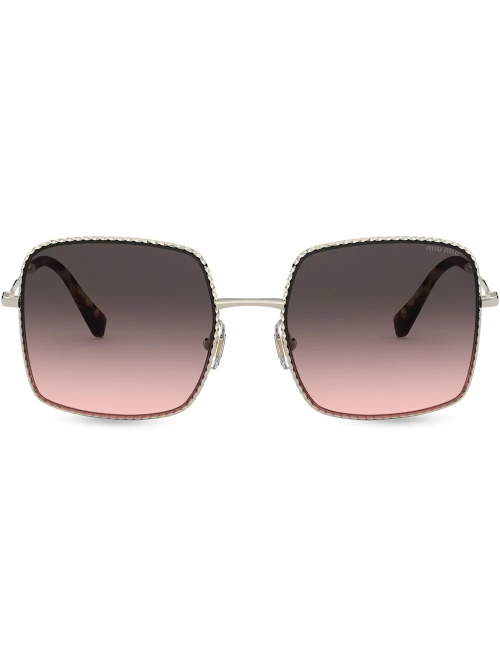 square-frame sunglasses The sun is out and the weather feels great? Well, that looks like the perfect excuse for you to grab these square-frame sunglasses from Miu Miu and go for a walk outside. All that style (really) needs to be seen. Highlights - Pink/silver-tone - Metal - Square frame - Gradient lenses - Nose pads - Straight arms - Curved tips - We know you'll look after them, but these glasses come with protection, just in case. Composition Metal (Other) 100% SIZE & FIT Measurement Arm Length 5.51 in(14 cm) Bridge Width 0.74 in(1.9 cm) Lens Diameter 2.2 in(5.6 cm)