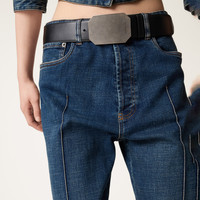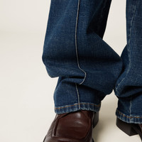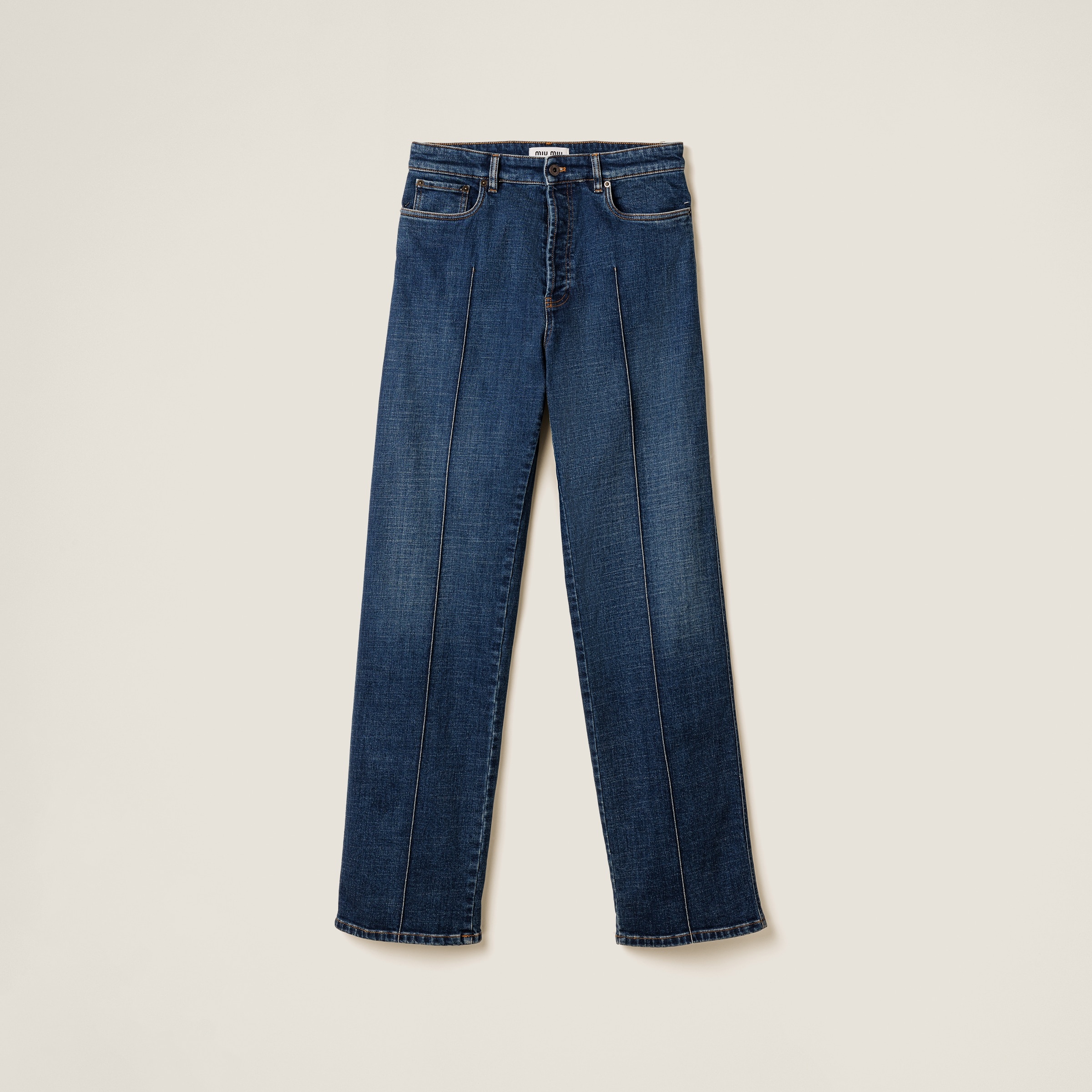 These stylish mid-rise denim trousers feature contrast stitching and an embroidered logo for a unique touch. - Product code: GWP546_15UJ_F0008_S_OOO - Washed treatment - Regular fit - Medium waist - Button closure - Contrast topstitching - Rounded pockets on front - Patch pocket on back - Total length 105 cm, size 25 with turn ups - Ironed crease - Embroidered logo logo - Imported - The model is 178 cm tall and wears a size 38 Materials Main material: 98% Cotton 2% Elastane