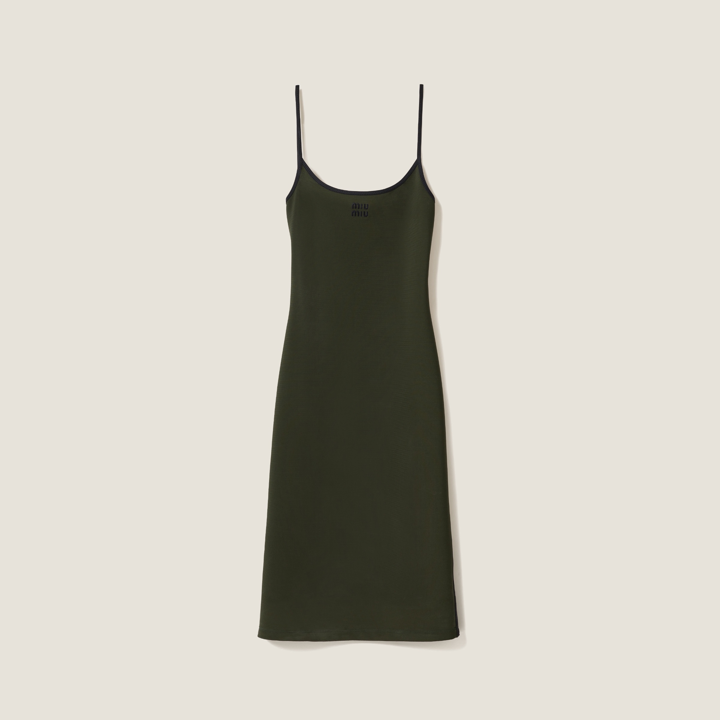 The chromatic contrast of the trim and Miu Miu logo characterizes this stretch jersey dress with a skinny fit and open back that recalls sportswear and swimwear. - Product code: MF5707_16T3_F0161_S_OOO - Skinny fit - Unlined - Scoop neck - Sleeveless - Straight hem - Embroidered logo - Imported Height 105cm Materials Main material: 6% Elastane 16% Polyamide 78% Viscose