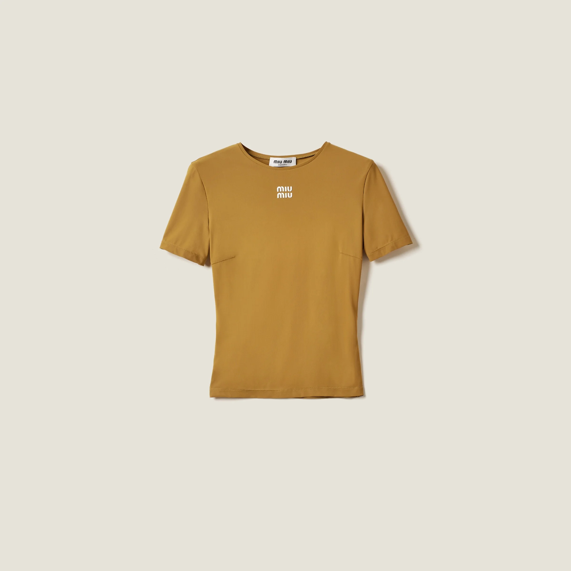 Sleek, minimalist, skinny fit lines characterize this stretch jersey top. The logo patch completes the design with an iconic note. - Product code: MT2002_122R_F0393_S_OOO - Skinny fit - Round neck - Short sleeves - Rubber logo patch - Imported - The model is 176 cm tall and wears a size 38 Materials Main material: 27% Elastane 73% Recycled Polyamide