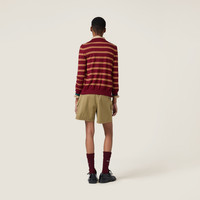 The stripe motif, an iconic element of Miu Miu style, is combined with fine knitwear, defining the slim fit of this cashmere and silk cardigan with the casual and sophisticated essence of the intarsia logo. - Product code: MMF949_150D_F0399_S_OOO - Stripe motif - Slim-fit silhouette - Long sleeves - Semi-raglan shoulder - Ribbed knit cuffs and hem - Front button closure - Intarsia logo - Imported - The model is 176 cm tall and wears a size 38 Height 58cm Materials Main material: 30% Silk 70% Cashmere