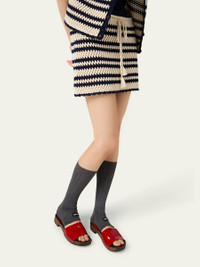 Miu Miu crochet knit skirt featuring a striped intarsia and a drawstring waistband Mid waist Mini length A-line silhouette Pull-on style Cotton Made in Italy Online Inquiries: BGS21_BA79W| Store Inquiries: #5045041