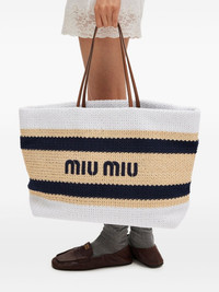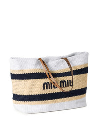 striped crochet tote bag Highlights - Cream white - Navy blue and beige stripes - Dual leather handles - Embroidered logo - Spacious interior - Zip pocket Composition Outer: Viscose 100%, Cotton 100%, Polyester 100%, Leather 100% SIZE & FIT Measurement DEPTH 6.29 in(16 cm) HEIGHT 12.99 in(33 cm) WIDTH 15.74 in(40 cm)
