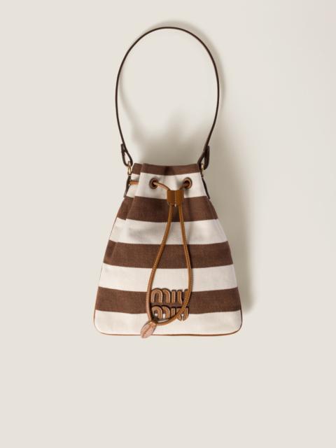 Classic summer hues animate the stripe motif that defines the essence of this drawstring pouch in which the mix of leather and canvas enhances the shape and elegant contrasts of Miu Miu style. - Product code: 5ND016_2IBB_F0966 - Leather handle - Drawstring closure - Linen blend interior - Leather lettering logo - Imported Height 23cm Width 20cm Materials Main material: Cotton Polyester