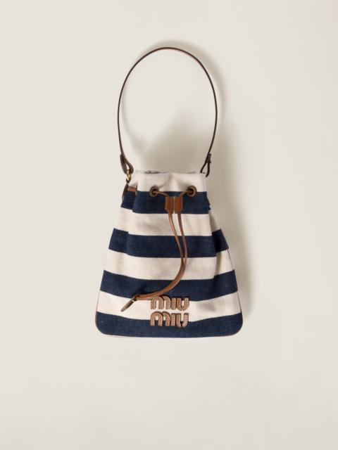 Classic summer hues animate the stripe motif that defines the essence of this drawstring pouch in which the mix of leather and canvas enhances the shape and elegant contrasts of Miu Miu style. - Product code: 5ND016_2IBB_F067K - Leather handle - Drawstring closure - Linen blend interior - Leather lettering logo - Imported Height 23cm Width 20cm Materials Main material: Cotton Polyester