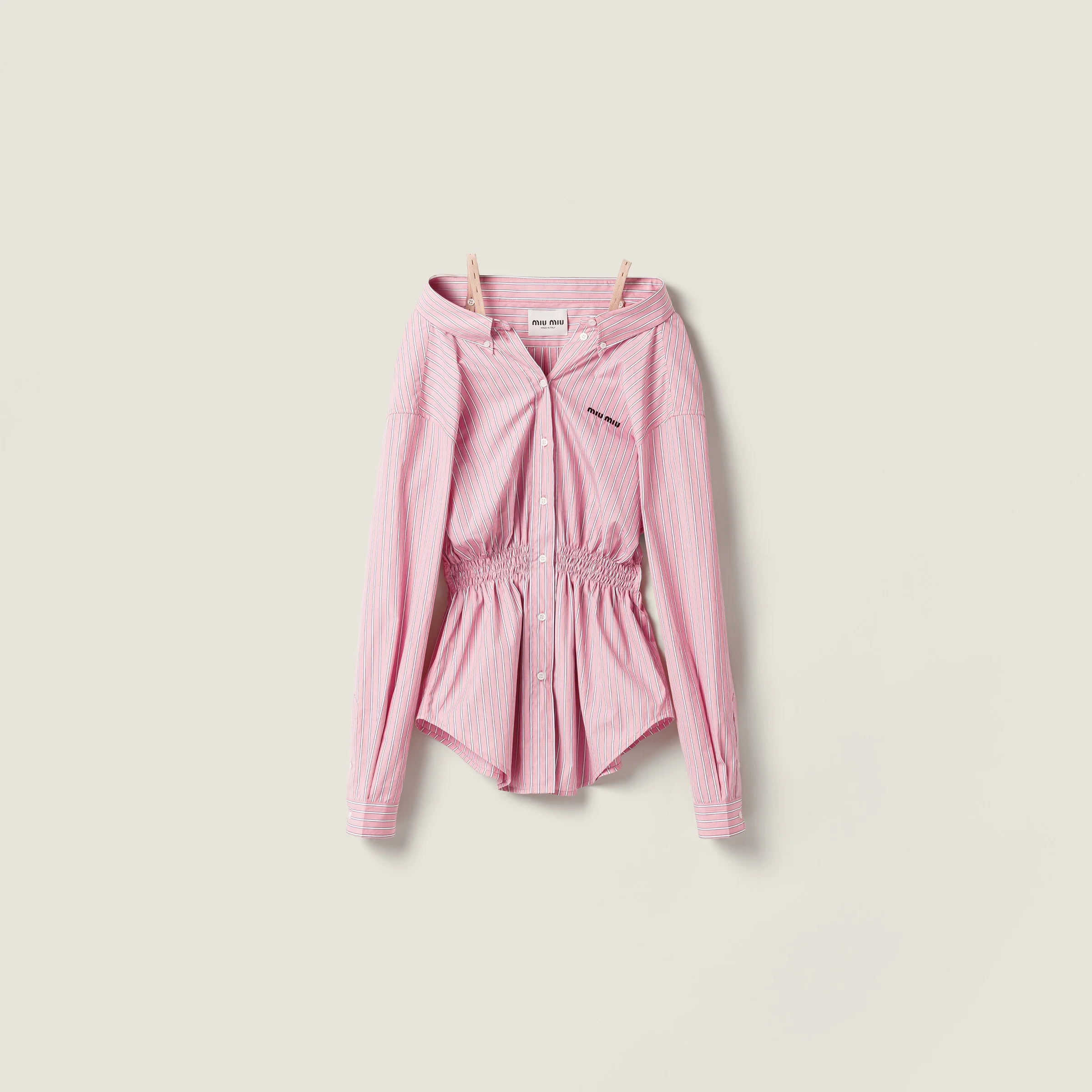 This striped poplin dress blends references to men's shirts with Miu Miu's feminine essence enhanced by the logo in a contrasting color and shoulder straps seen on the runway, for versatile and personal styling. - Product code: MF6125_180U_F0028_S_OOO - Fitted silhouette - Front button closure - Long sleeves - Elasticized waist detail - Embroidered logo - Imported Materials Main material: 100% Cotton