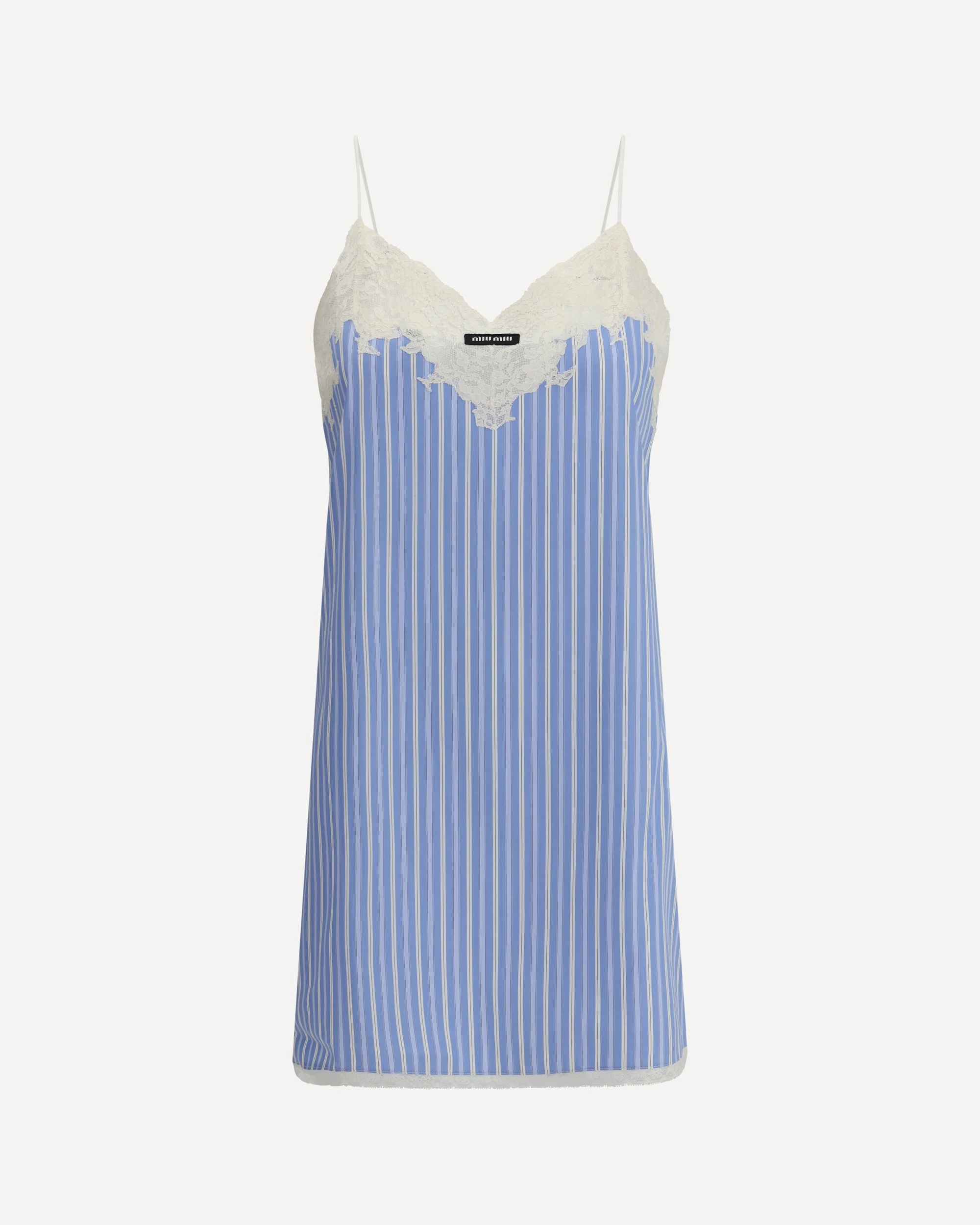 Miu Miu's mini Dress is made of pure cotton poplin with an embroidered striped lace insert at the top. Featuring a V-neckline, thin straps and a logo applique on the chest, it is unlined for optimal comfort and a refined look. DETAILS - Sku: MF5974SOOO1730_F0076 - Season: AW25 - Fit: Regular - Composition: GENERAL 100% Cotton - MADE IN ITALY