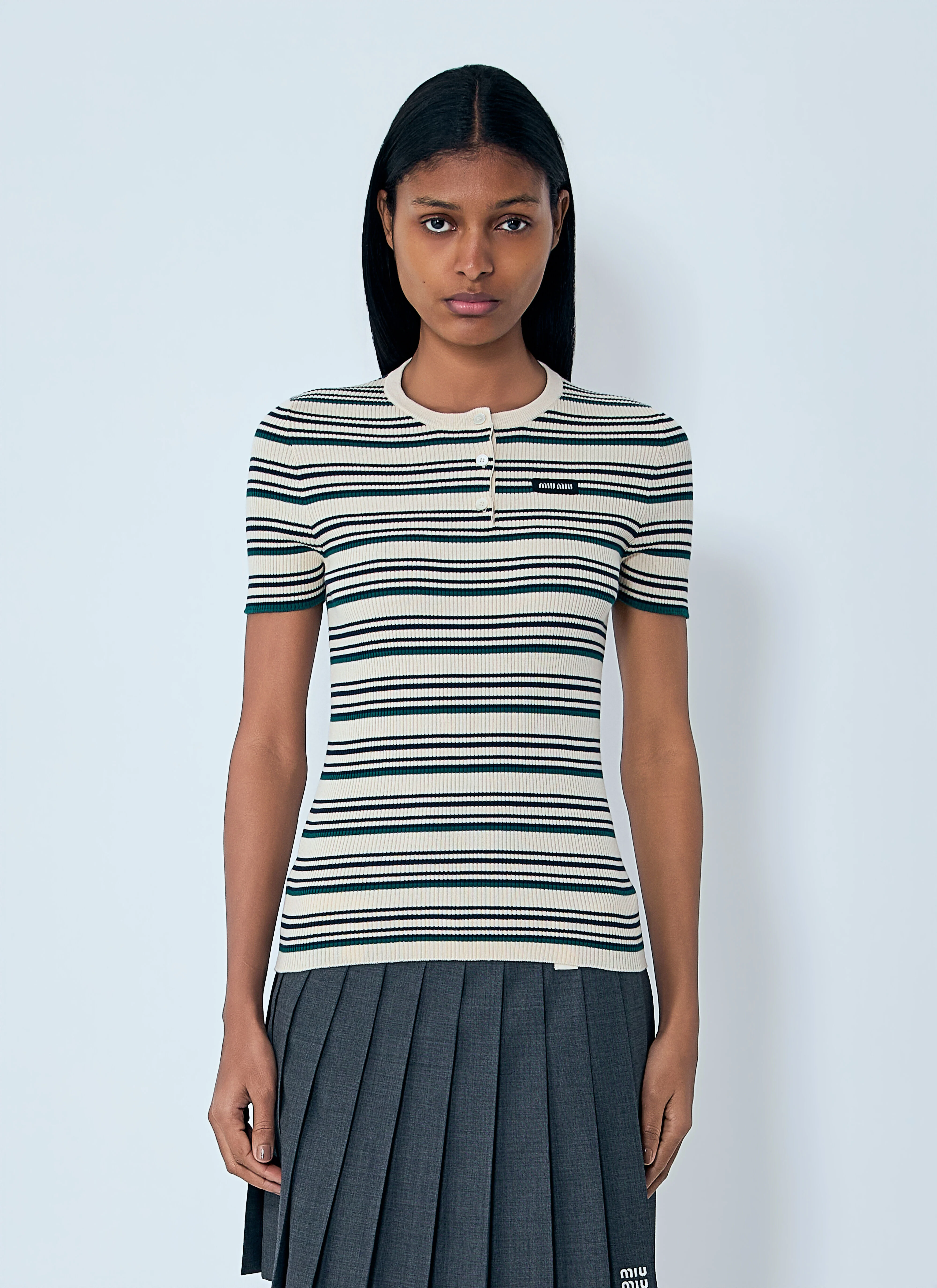 Ribbed knit top with stripe pattern and button placket. - Crewneck - Short sleeves - Ribbed trims - 100% Cotton - Color: Beige - Code: MML03Y 1848 F0018