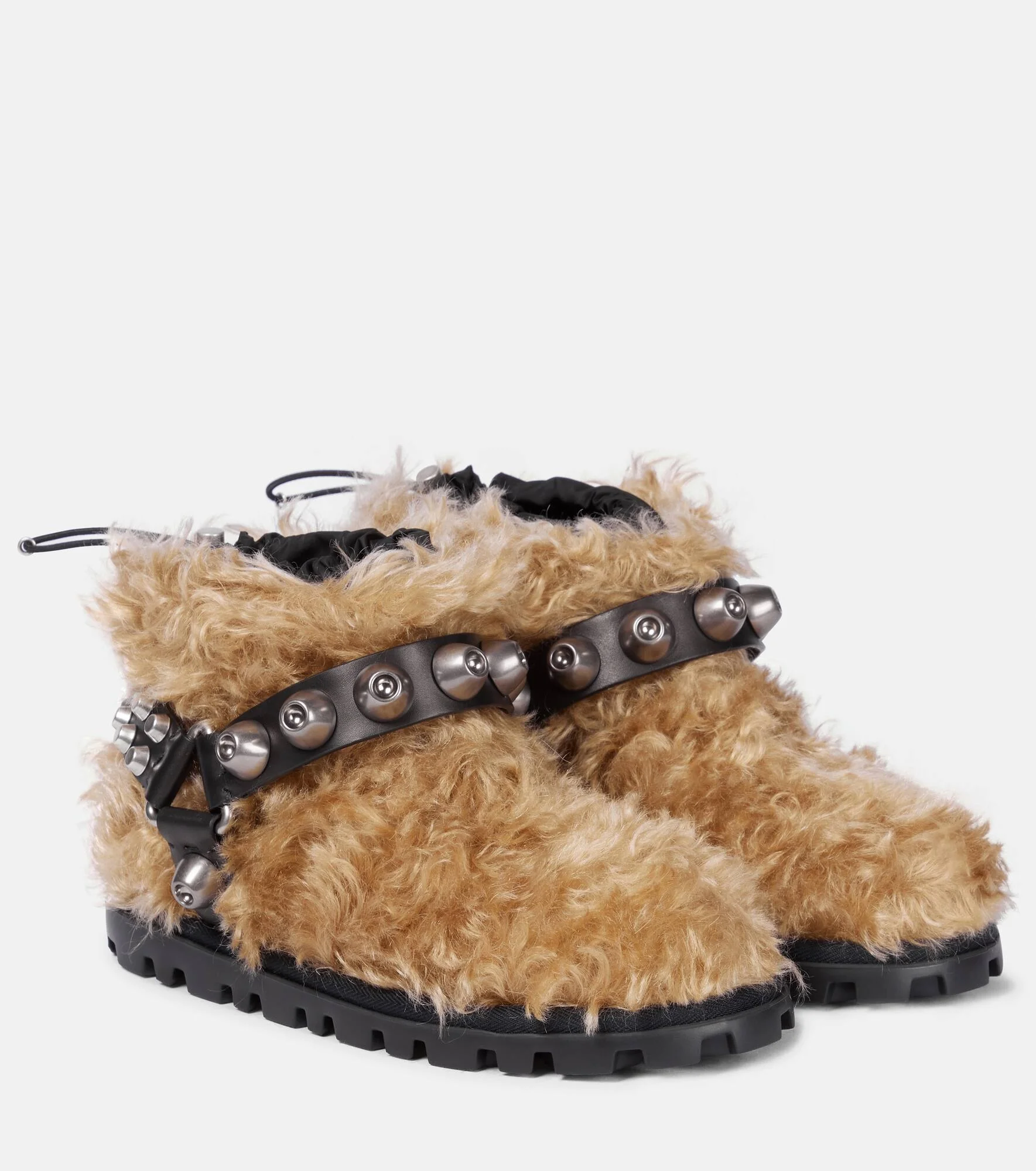 There's so much to love about these brown ankle boots from Miu Miu – for one, they're covered in a plush, teddy-textured blend of mohair and cotton. They feature canvas drawstrings at the shafts, studded leather harnesses around the heel, and lugged rubber outsoles. Product Details - Lining: leather, fabric - Sole: leather insole, rubber sole - Upper: fabric - Toe shape: round toe - Trim: calf leather - Designer color name: Camello - Made in Italy - Item number: P00595393 Size & Fit - Fits slightly large to size - we recommend trying a half size smaller - Slightly narrow at the back - European sizes - 2cm-1" platform (size EU 38) - 3cm-1" wedge heel (size EU 38)