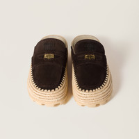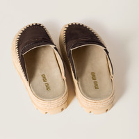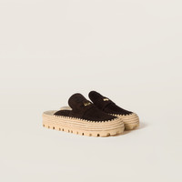 The lifestyle lines of these suede mules are enhanced by the raffia flatform mid-sole with a summery mood and the refined detail of the coin that identifies one of Miu Miu's style codes. - Product code: 5D380E_054_F0003_F_010 - Suede apron and band with slot and logo-engraved coin - Leather lining - EVA sole - Leather insole - Logo embossed on the tongue and screen-printed on the insole - Imported Materials Main material: Calfskin