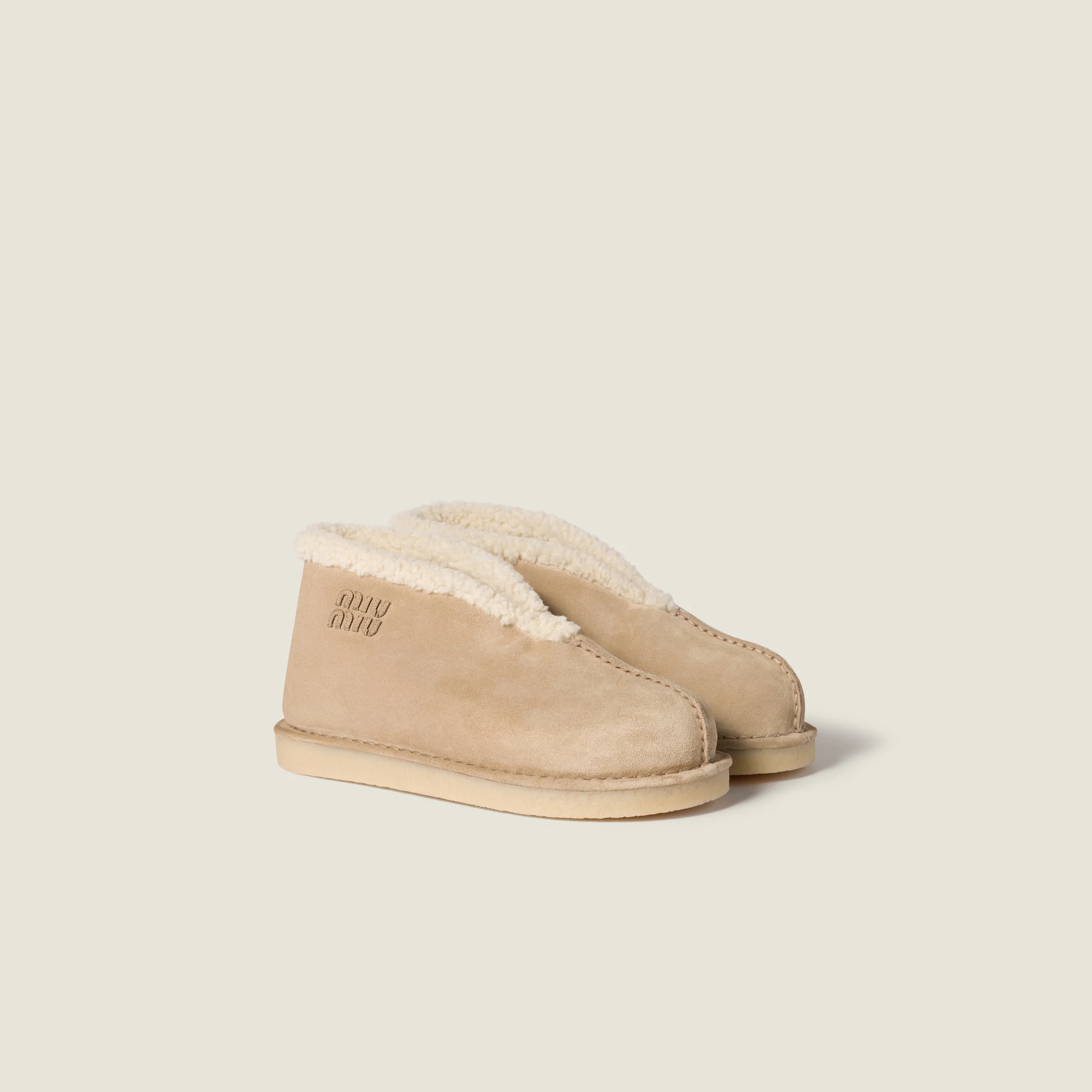 A soft lightness defines the silhouette of these suede and shearling booties that combine sophistication and functionality. Materials and volumes enhance the contemporary and youthful spirit of Miu Miu looks. - Product code: 5T516E_Z0G_F0F24_F_ZF15 - Upper with embroidered leather logo - Shearling lining - Boot leg: 10.5 cm - Rubber sole - Removable shearling-covered insole - Screen-printed logo on the insole - Imported Materials Main material: Calfskin