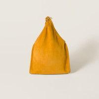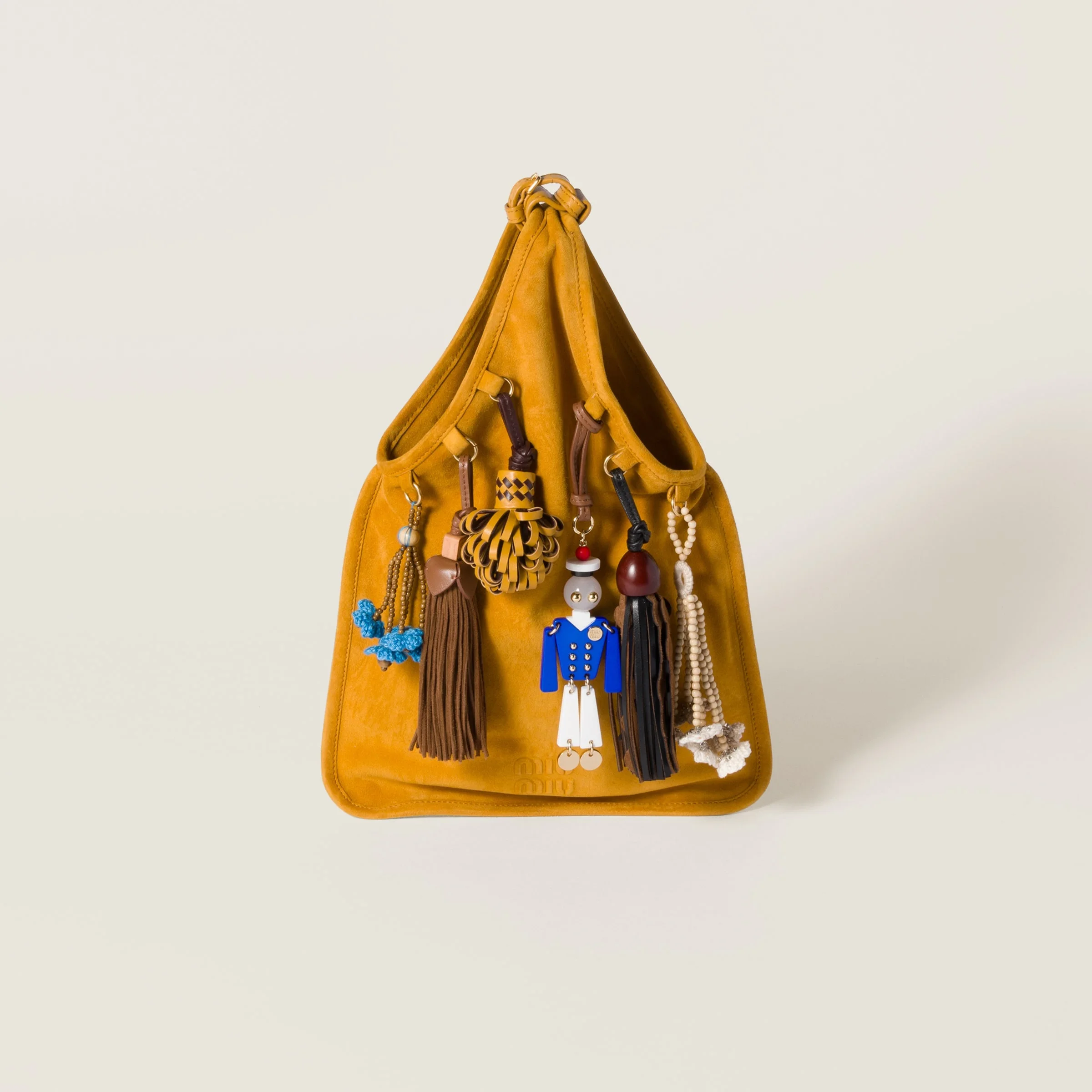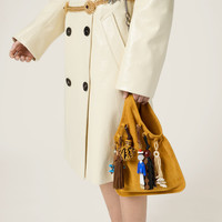 Elegant, soft suede is combined with the playful character of small removable tricks that embellish this hobo bag, a perfect interpretation of runway inspirations and Miu Miu's Messy-Chic character. - Product code: 5BA295_2IBU_F0R55_V_OT2 - Leather handle - Trick appliques - Gold-tone hardware - Leather lining with patch pocket - Embossed lettering logo - Imported Height 37cm Width 24cm Materials Main material: Lambskin