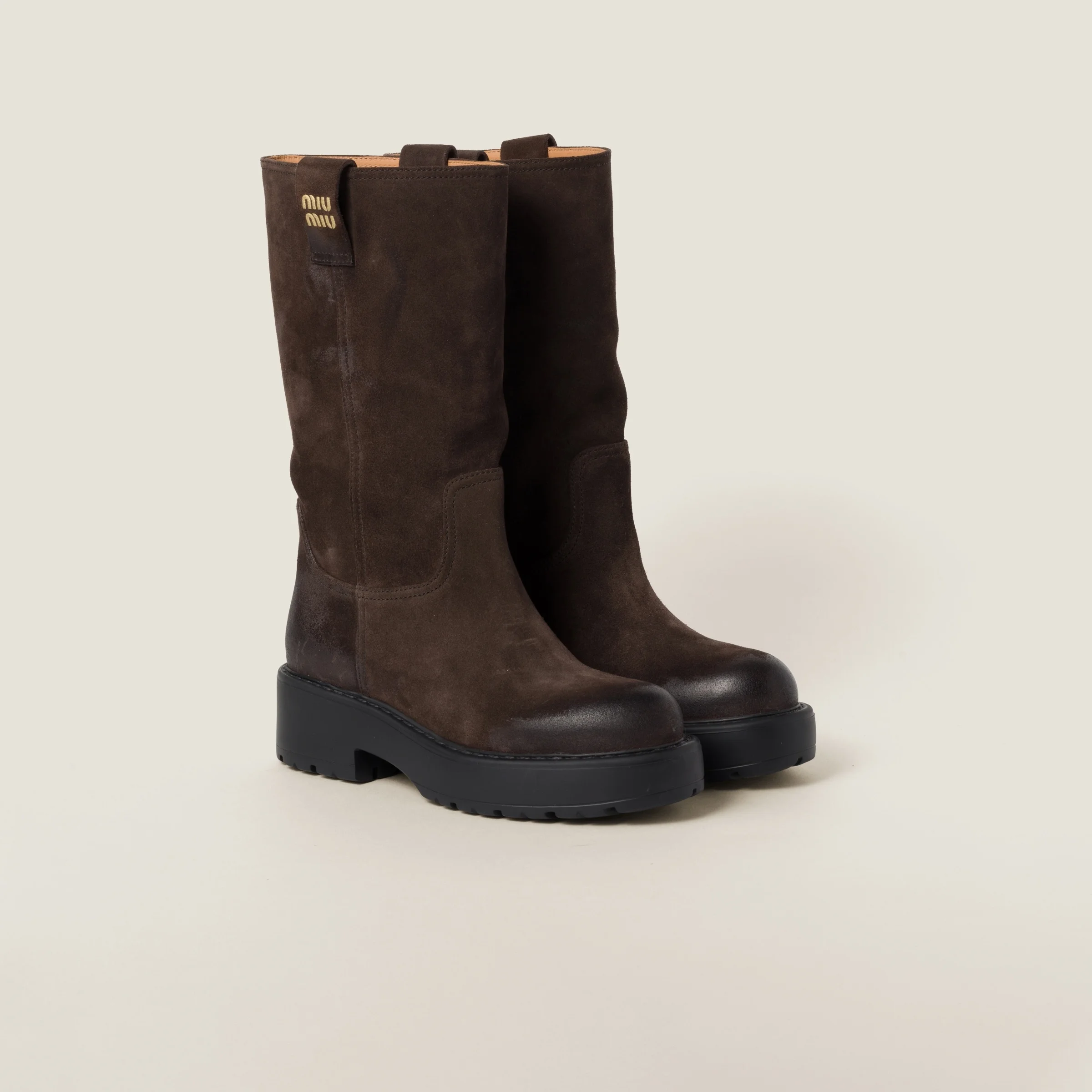 Sleek lines and the soft touch of suede characterize these boots. The Miu Miu logo stands out thanks to its contrast in color and iconic character. - Product code: 5U270E_0B2_F0003_F_055 - Leather lining - Embossed and screen-printed logo - Boot leg: 28 cm - EVA sole with logo - Lug tread - Heel height: 55 mm - Leather insole - Imported Materials Main material: Calfskin