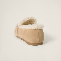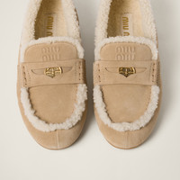 In the '50s, loafers were part of school uniforms worn by U.S. prep school and college students. Annoyed by having to wear a uniform, students started inserting a shiny penny in the slot of the leather band, giving rise to the name "Penny Loafers". Miu Miu reimagines this timeless footwear synonymous with tradition in a suede version with shearling lining for the new collection. - Product code: 5D273E_Z0G_F0379_F_005 - Apron with leather band and logo-engraved coin - Shearling lining - Embossed logo on the tongue - Rubber sole - Shearling-covered insole - Imported