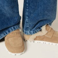 These suede mules are inspired by the classic loafer, as demonstrated by the "penny" tucked into the strap on the apron, giving rise to the name "Penny Loafer". The shearling lining adds a cozy touch to the shoe. - Product code: 5D058E_Z0G_F0379_F_D010 - Upper with leather band and logo-engraved metal coin - Shearling lining - Embossed logo on the tongue - EVA sole - Star-patterned tread - Shearling-covered insole - Imported Materials Main material: Calfskin
