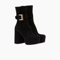Cod. 5UP065_008_F0002_F_110 Decorated with a shiny large buckle, these booties stand out for their sophisticated, modern line. Made of suede, the style has a chunky heel and bold personality. - Upper with strap and logo-engraved metal buckle - Leather lining - Fabric logo label - Side zipper closure - 18 cm boot leg - Leather and rubber sole - 110 mm suede-covered heel - 40 mm suede-covered platform - Leather insole MATERIALS Leather