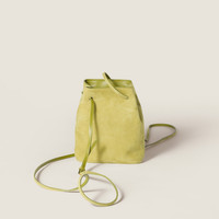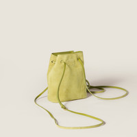 Vintage inspirations and a sleek design define this soft suede pouch, a distinctive element of Miu Miu's experimental wardrobe. - Product code: 5NF460_ACSS_F077G - Adjustable leather shoulder strap - One card slot - Light waterproof cotton lining - Embossed lettering logo - Imported Height 17cm Width 14cm Length 6cm Materials Main material: Lambskin