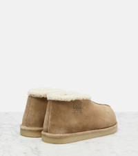These ankle boots from Miu Miu are made of smooth suede and lined with soft shearling for all-day comfort. The pair is set on sturdy soles and finished with logo detailing on the sides. Product Details - Upper: calf leather (suede) - Lining: shearling - Sole: shearling insole, rubber sole - Color: beige - Toe shape: round toe - Made in Italy - Includes: shoe box, dust bag - Designer color name: Deserto - Item color: beige - Item number: P01075446 Size & Fit - True to size - European sizes - 2cm-1" platform