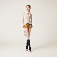 These irreverent, bold and casual suede shorts convey Miu Miu's provocative femininity. The special treatment applied by hand makes each garment unique, giving it a vintage look and a slight shading in color. The belt with buckle adds a refined contrast and a shiny detail to the shorts. - Product code: MPP380_104R_F0418_S_232 - Lined - Regular fit - Zipper fly with hook - Belt - Waxed treatment - Imported - The model is 177 cm tall and wears a size 38 - Height: 40cm