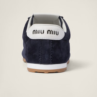 Refined workmanship and materials meet the sleek and extremely light design in these new Miu Miu suede sneakers. The logo stands out on the tongue and on the back thanks to its iconic character. - Product code: 5E114E_054_F0008_F_005 - Upper with perforated detail - Leather lining - Screen-printed logo on the tongue and heel - Closure with flat laces - Rubber sole - Patterned tread - Removable leather-covered insole - Imported Materials Main material: Calfskin