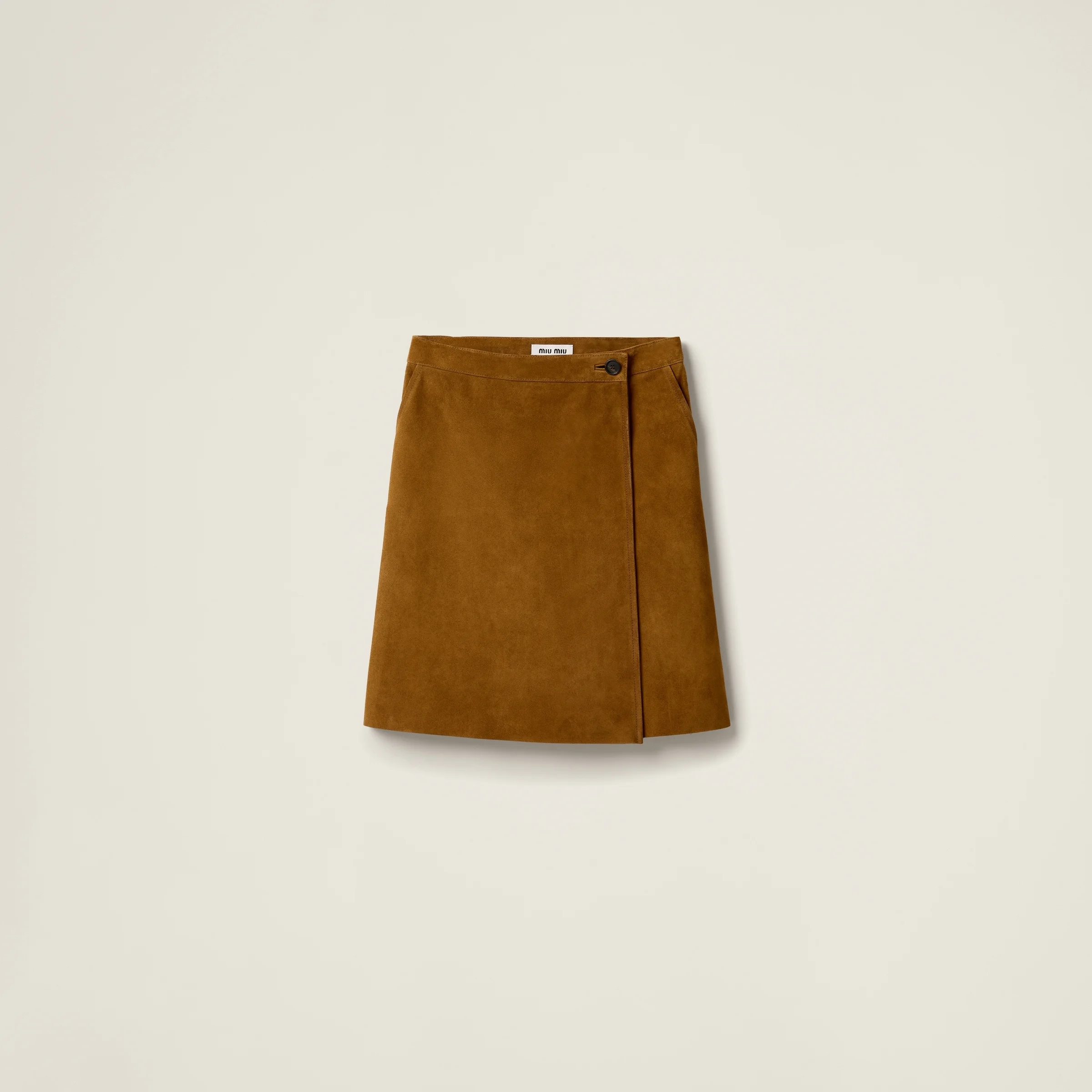 The worn look of this suede skirt underlines Miu Miu's continuous experimentation with vintage references, enhancing the timeless allure of iconic and refined garments. - Product code: MPD803_1421_F0393_S_OOO - Regular fit - Lined garment - Side button closure - Welt pockets - Constructed waistband - Embossed lettering logo - Final waxing treatment - Imported - The model is 177 cm tall and wears a size 38 Height 56cm Materials Main material: Calfskin