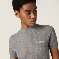 The fine cashmere of this sweater acquires character thanks to the lacy motif and intarsia logo that gives the simple design femininity and charm, perfect for elegant, contemporary looks. - Product code: MMLB30_17NN_F0031_S_OOO - Ribbed knit/lacy motif - Slim-fit silhouette - Short sleeves - Ribbed knit crew neck - Semi-raglan shoulder - Ribbed knit sleeve trim and hem - Intarsia logo - Imported - The model is 178 cm tall and wears a size 38 Height 58cm Materials Main material: 100% Cashmere