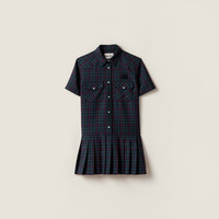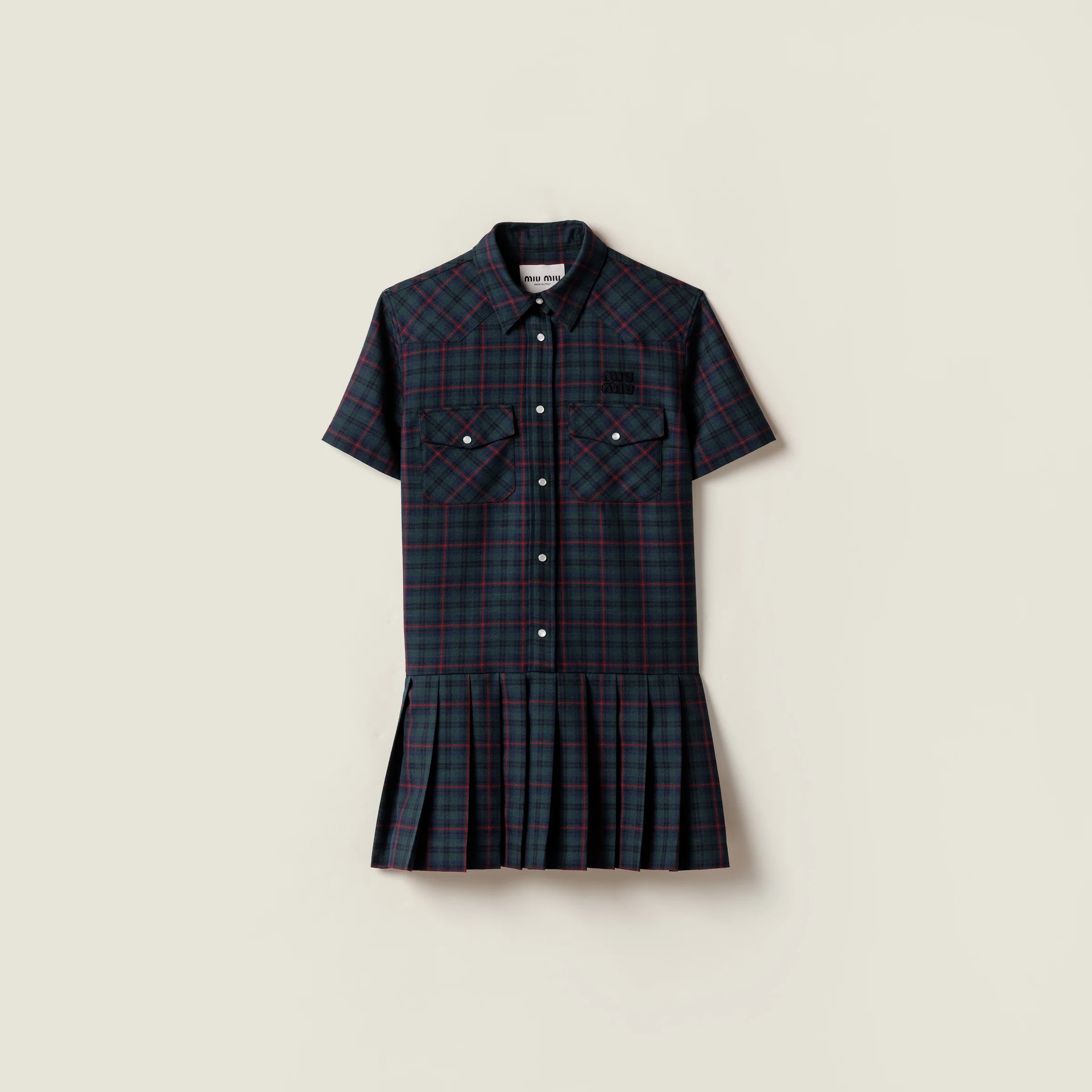 Plaid, a pattern with a vintage mood, interprets Miu Miu's experimentation on the classic wardrobe and defines the identity of this mini-dress with an elegant pleated skirt and a design inspired by men's shirts. - Product code: MF5982_174R_F0D3Z_S_OOO - Straight fit - Shirt-style collar - Front snap closure - Short sleeves - Front pockets - Logo on the front - Imported - The model is 176 cm tall and wears a size 38 Height 80cm Materials Main material: 100% Virgin Wool