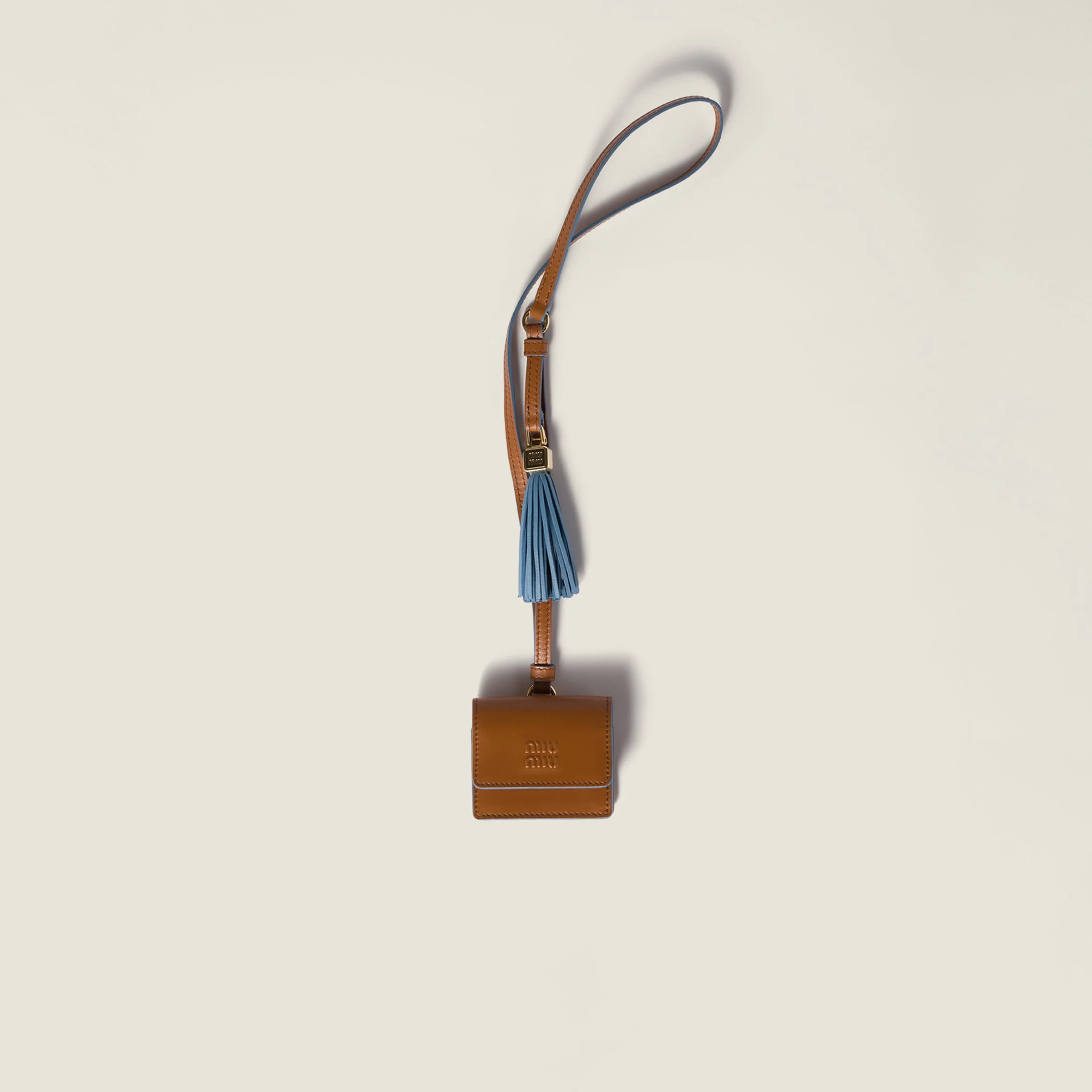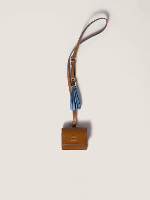 This leather trick, an expression of playful elegance, reflects Miu Miu spirit through iconic details like the tassel charm and the lettering logo on the mini pouch. - Product code: 5TL515_2IDW_F0NP5 - With mini pouch - Snap closure - Adjustable leather neck strap with charm detail - Embossed lettering logo - Imported Height 5.5cm Width 7cm Length 3.1cm Materials Main material: Calfskin