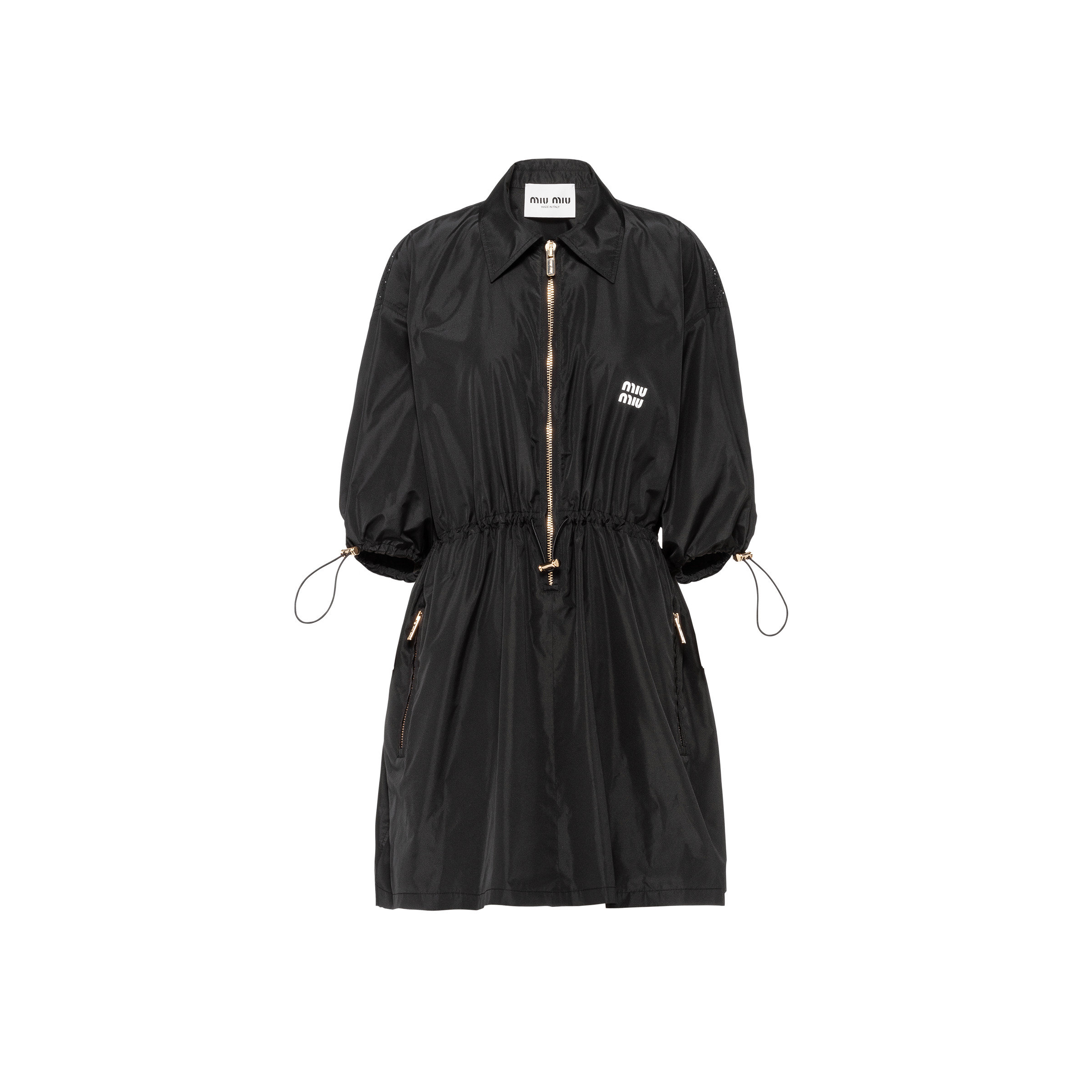 In this new technical silk mini-dress, Miu Miu's subversive femininity is expressed through a play on proportions and a careful attention to detail. The printed logo stands out against the smooth fabric and the zippers introduce a refined contrast, while the drawstrings at the waist and on the sleeves create volume compared to the mini-dress silhouette, with a very refined yet bold final result. - Product code: MF4806_121G_F0002_S_231 - Flared fit - Shirt collar - Front zipper closure - Welt zipper pockets - Printed logo - Imported Height 85cm Materials Main material: 24% Silk 76% Recycled Polyester