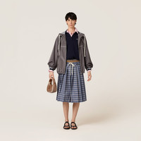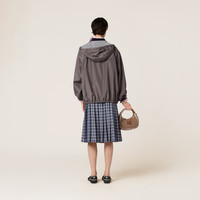 Technical silk fabric with a sporty, casual feel enhances the lines of this zipper blouson jacket that is perfect paired with classic garments to express the essence of the Miu Miu uniform. - Product code: ML1234_163N_F0024_S_OOO - Lined garment - Long sleeves - Elasticized cuff - Zipper closure - Zipper pockets - Lined drawstring hood - Logo patch - Imported Height 80cm Materials Main material: 24% Silk 76% Recycled Polyester