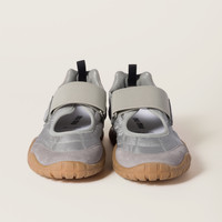 Tyre combines elegance and sporty functionality. The dynamic rubber sole, which is flexible and scuff-proof, recalls the pattern on tires. Made of technical fabric and suede, this version of the ballerina expresses Miu Miu's bold identity. - Product code: 5F416E_D7C_F0424_F_005 - Upper with hook-and-loop fastener strap - Embossed and screen-printed logo - EVA sole with logo - Removable leather-covered insole - Imported Materials Main material: Recycled Polyamide